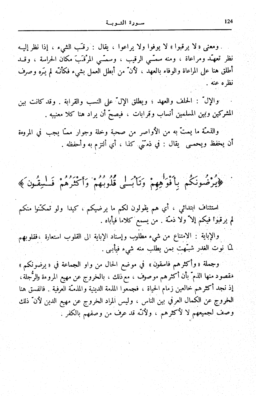وَمَعْنَى لَا يَرْقُبُوا لَا يُوَفُّوا وَلَا يُرَاعُوا، يُقَالُ: رَقَبَ الشَّيْءَ، إِذَا نَظَرَ إِلَيْهِ نَظَرَ تَعَهُّدٍ وَمُرَاعَاةٍ، وَمِنْهُ سُمِّيَ الرَّقِيبُ، وَسُمِّيَ الْمَرْقَبُ مَكَانُ الْحِرَاسَةِ، وَقَدْ أُطْلِقَ هُنَا عَلَى الْمُرَاعَاةِ وَالْوَفَاءِ بِالْعَهْدِ، لِأَنَّ مَنْ أَبْطَلَ الْعَمَلَ بِشَيْءٍ فَكَأَنَّهُ لَمْ يَرَهُ وَصَرَفَ نَظَرَهُ عَنْهُ.