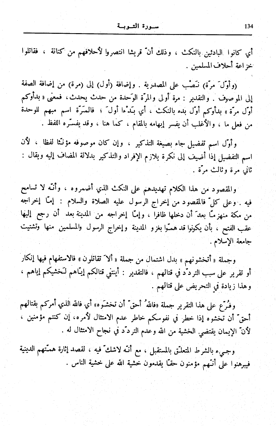 وَجُمْلَةُ أَتَخْشَوْنَهُمْ بَدَلُ اشْتِمَالٍ مِنْ جُمْلَةِ أَلا تُقاتِلُونَ فَالِاسْتِفْهَامُ فِيهَا إِنْكَارٌ أَوْ تَقْرِيرٌ عَلَى سَبَبِ التَّرَدُّدِ فِي قِتَالِهِمْ، فَالتَّقْدِيرُ: أَيَنْتَفِي قِتَالُكُمْ إِيَّاهُمْ لِخَشْيِكُمْ إِيَّاهُمْ، وَهَذَا