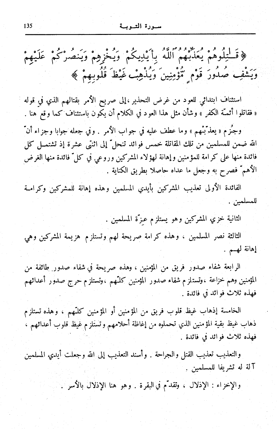قاتِلُوهُمْ يُعَذِّبْهُمُ اللَّهُ بِأَيْدِيكُمْ وَيُخْزِهِمْ وَيَنْصُرْكُمْ عَلَيْهِمْ وَيَشْفِ صُدُورَ قَوْمٍ مُؤْمِنِينَ (14) وَيُذْهِبْ غَيْظَ قُلُوبِهِمْ وَيَتُوبُ اللَّهُ عَلى مَنْ يَشاءُ وَاللَّهُ عَلِيمٌ حَكِيمٌ (15)