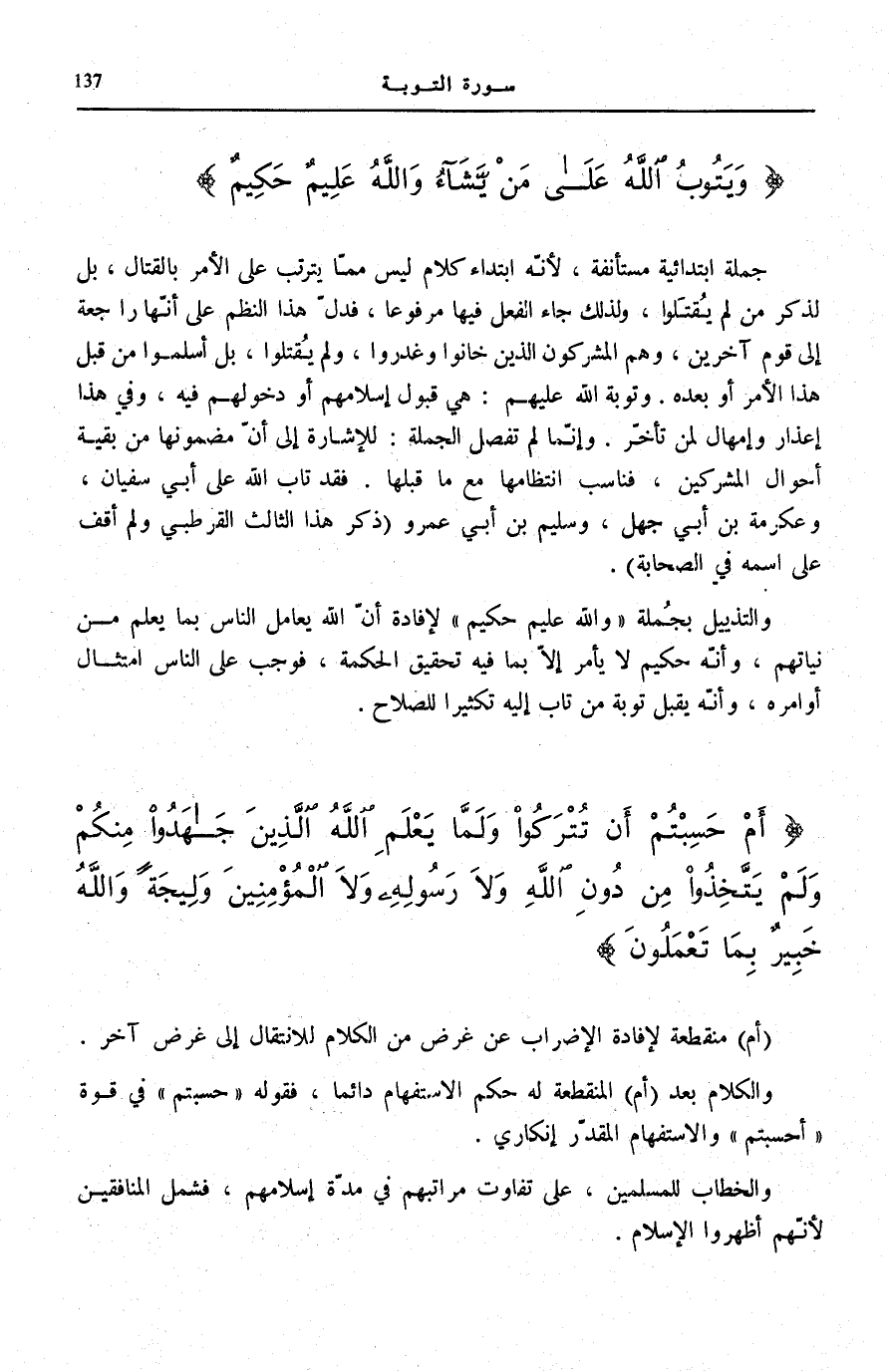 جُمْلَةٌ ابْتِدَائِيَّةٌ مُسْتَأْنَفَةٌ، لِأَنَّهُ ابْتِدَاءُ كَلَامٍ لَيْسَ مِمَّا يَتَرَتَّبُ عَلَى الْأَمْرِ بِالْقِتَالِ، بَلْ لِذِكْرِ مَنْ لَمْ يُقْتَلُوا، وَلِذَلِكَ جَاءَ الْفِعْلُ فِيهَا مَرْفُوعًا، فَدَلَّ هَذَا النَّظْمُ عَلَى أَنَّهَا رَاجِعَةٌ إِلَى قَوْمٍ آخَرِينَ، وَهُمُ الْمُشْرِكُونَ الَّذِينَ خَانُوا وَغَدَرُوا، وَلَمْ يُقْتَلُوا، بَلْ أَسْلَمُوا مِنْ قَبْلِ هَذَا الْأَمْرِ أَوْ بَعْدَهُ. وَتَوْبَةُ اللَّهِ عَلَيْهِمْ: هِيَ قَبُولُ إِسْلَامِهِمْ أَوْ دُخُولُهُمْ فِيهِ، وَفِي هَذَا إِعْذَارٌ وَإِمْهَالٌ لِمَنْ تَأَخَّرَ. وَإِنَّمَا لَمْ تُفْصَلِ الْجُمْلَةُ: لِلْإِشَارَةِ إِلَى أَنَّ مَضْمُونَهَا مِنْ بَقِيَّةِ أَحْوَالِ الْمُشْرِكِينَ، فَنَاسَبَ انْتِظَامَهَا مَعَ مَا قَبْلَهَا. فَقَدْ تَابَ اللَّهُ عَلَى أَبِي سُفْيَانَ، وَعِكْرِمَةَ بْنِ أَبِي جَهْلٍ، وَسُلَيْمِ بْنِ أَبِي عَمْرٍو (ذكر هَذَا الثَّالِثَ الْقُرْطُبِيُّ وَلَمْ أَقِفْ عَلَى اسْمِهِ فِي الصَّحَابَةِ) .