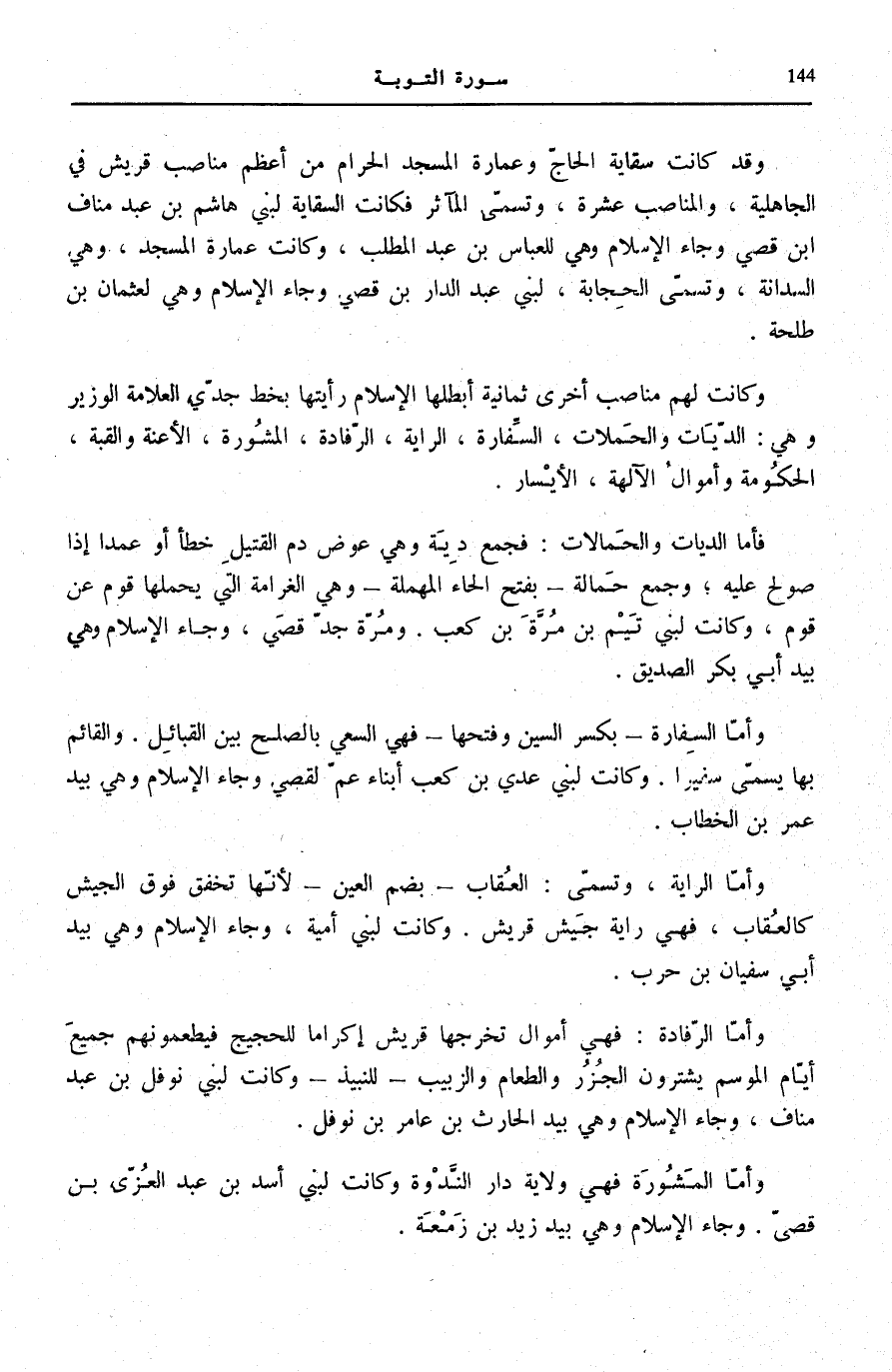 وَكَانَتْ لَهُمْ مَنَاصِبُ أُخْرَى ثَمَانِيَةً أَبْطَلَهَا الْإِسْلَامُ رَأَيْتُهَا بِخَطِّ جَدِّي الْعَلَّامَةِ الْوَزِيرِ وَهِي: الدّيات والحملات، السِّفَارَةُ، الرَّايَةُ، الرِّفَادَةُ، الْمَشُورَةُ، الْأَعِنَّةُ وَالْقُبَّةُ، الْحُكُومَةُ وَأَمْوَالُ الْآلِهَةِ، الْأَيْسَارُ.