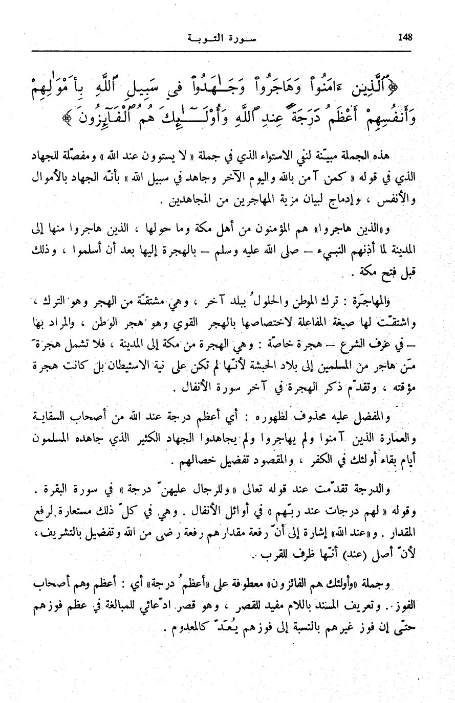 الَّذِينَ آمَنُوا وَهاجَرُوا وَجاهَدُوا فِي سَبِيلِ اللَّهِ بِأَمْوالِهِمْ وَأَنْفُسِهِمْ أَعْظَمُ دَرَجَةً عِنْدَ اللَّهِ وَأُولئِكَ هُمُ الْفائِزُونَ (20)