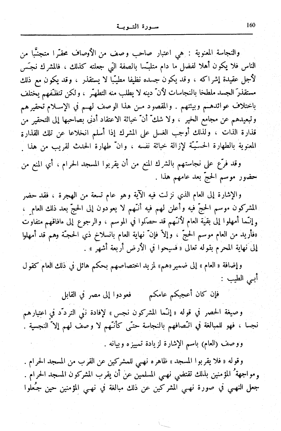 وَقَوْلُهُ: فَلا يَقْرَبُوا الْمَسْجِدَ ظَاهِرُهُ نَهْيٌ لِلْمُشْرِكِينَ عَنِ الْقُرْبِ مِنَ الْمَسْجِدِ الْحَرَامِ.