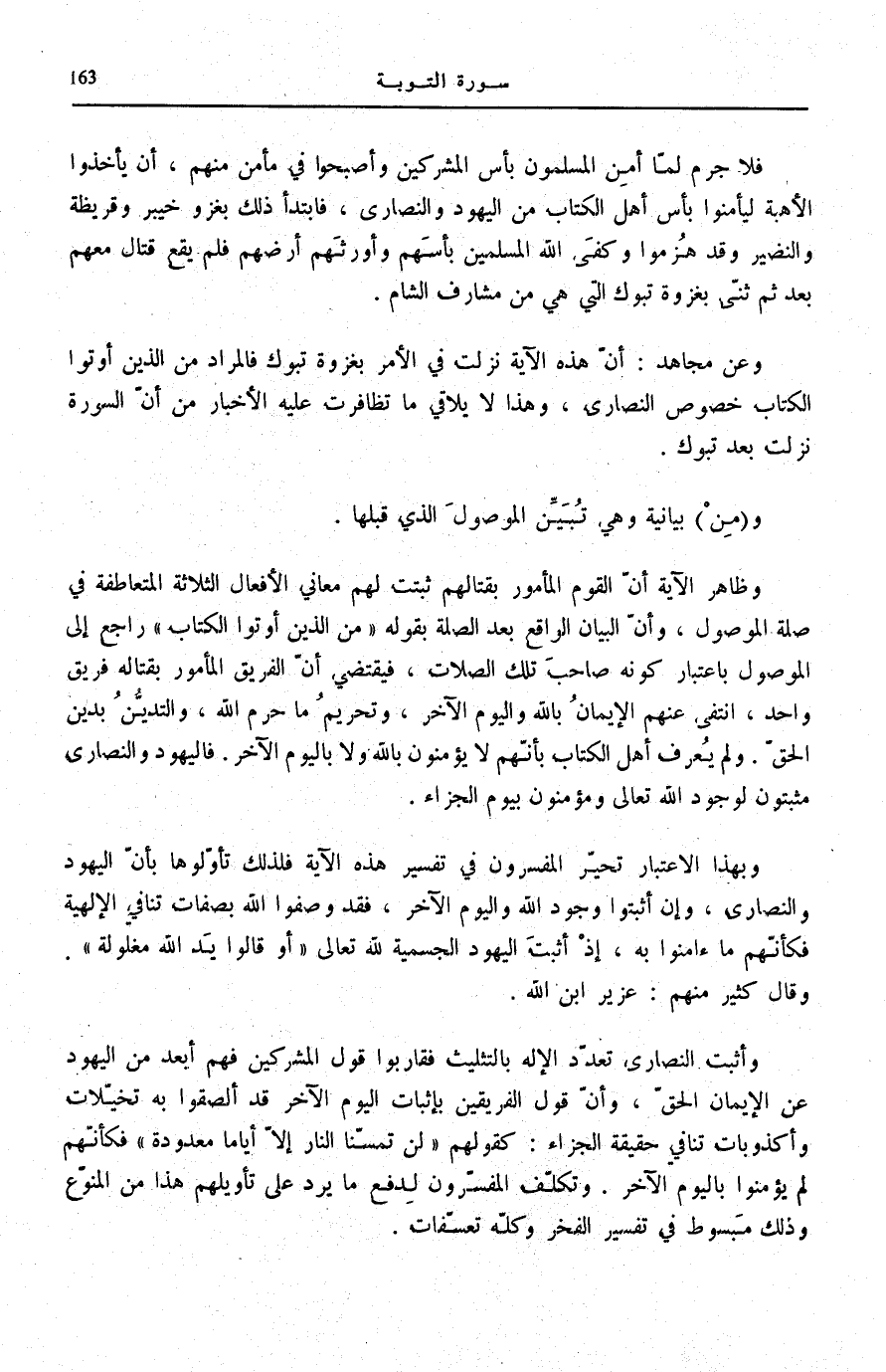 وَظَاهِرُ الْآيَةِ أَنَّ الْقَوْمَ الْمَأْمُورَ بِقِتَالِهِمْ ثَبَتَتْ لَهُمْ مَعَانِي الْأَفْعَالِ الثَّلَاثَةِ الْمُتَعَاطِفَةِ فِي صِلَةِ الْمَوْصُولِ، وَأَنَّ الْبَيَانَ الْوَاقِعَ بَعْدَ الصِّلَةِ بِقَوْلِهِ: مِنَ الَّذِينَ أُوتُوا الْكِتابَ رَاجِعٌ إِلَى الْمَوْصُولِ بِاعْتِبَارِ كَوْنِهِ صَاحِبَ تِلْكَ الصِّلَاتِ، فَيَقْتَضِي أَنَّ الْفَرِيقَ الْمَأْمُورُ بِقِتَالِهِ فَرِيقٌ وَاحِدٌ، انْتَفَى عَنْهُمُ الْإِيمَانُ بِاللَّهِ وَالْيَوْمِ الْآخِرِ، وَتَحْرِيمُ مَا حَرَّمَ اللَّهُ، وَالتَّدَيُّنُ بِدِينِ الْحَقِّ.