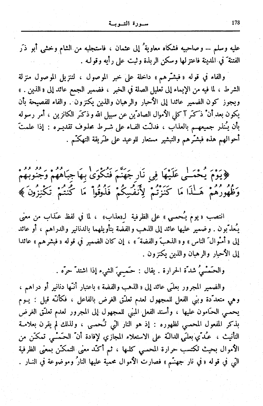 انْتَصَبَ يَوْمَ يُحْمى على الظَّرْفِيَّة لعذاب [التَّوْبَة: 34] ، لِمَا فِي لَفْظِ عَذَابٍ مِنْ مَعْنَى يُعَذَّبُونَ. وَضَمِيرُ عَلَيْها عَائِدٌ إِلَى الذَّهَبَ وَالْفِضَّةَ [التَّوْبَة: 34] بِتَأْوِيلِهِمَا بِالدَّنَانِيرِ وَالدَّرَاهِمِ، أَوْ عَائِدٌ إِلَى أَمْوالَ النَّاسِ [التَّوْبَة: 34] والذَّهَبَ وَالْفِضَّةَ [التَّوْبَة: 34] ، إِنْ كَانَ الضَّمِيرُ فِي قَوْله: فَبَشِّرْهُمْ [التَّوْبَة: 34] عَائِدًا إِلَى الْأَحْبارِ وَالرُّهْبانِ والَّذِينَ يَكْنِزُونَ [التَّوْبَة: 34] .