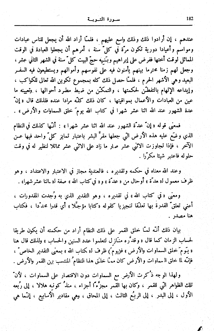 عِنْدَهُمْ، إِنْ أَرَادُوا ذَلِكَ وَذَلِكَ وَاسْعٌ عَلَيْهِمْ، فَلَمَّا أَرَادَ اللَّهُ أَنْ يَجْعَلَ لِلنَّاسِ عِبَادَاتٍ وَمَوَاسِمَ وَأَعْيَادًا دَوْرِيَّةً تَكُونُ مَرَّةً فِي كُلِّ سَنَةٍ، أَمَرَهُمْ أَنْ يَجْعَلُوا الْعِبَادَةَ فِي الْوَقْتِ الْمُمَاثِلِ لِوَقْتِ أُخْتِهَا فَفَرَضَ عَلَى إِبْرَاهِيمَ وَبَنِيهِ حَجَّ الْبَيْتِ كُلَّ سَنَةٍ فِي الشَّهْرِ الثَّانِي عَشَرَ، وَجَعَلَ لَهُمْ زَمَنًا مُحْتَرَمًا بَيْنَهُمْ يَأْمَنُونَ فِيهِ عَلَى نُفُوسِهِمْ وَأَمْوَالِهِمْ وَيَسْتَطِيعُونَ فِيهِ السَّفَرَ الْبَعِيدَ وَهِيَ الْأَشْهُرُ الْحُرُمُ، فَلَمَّا حَصَلَ ذَلِكَ كُلُّهُ بِمَجْمُوعِ تَكْوِينِ اللَّهِ تَعَالَى لِلْكَوَاكِبِ، وَإِيدَاعِهِ الْإِلْهَامَ بِالتَّفَطُّنِ لِحِكْمَتِهَا، وَالتَّمَكُّنِ مِنْ ضَبْطِ مُطَّرِدِ أَحْوَالِهَا، وَتَعْيِينِهِ مَا عُيِّنَ مِنَ الْعِبَادَاتِ وَالْأَعْمَالِ بِمَوَاقِيتِهَا، كَانَ ذَلِكَ كُلُّهُ مُرَادًا عِنْدَهُ فَلِذَلِكَ قَالَ: إِنَّ عِدَّةَ الشُّهُورِ عِنْدَ اللَّهِ اثْنا عَشَرَ شَهْراً فِي كِتابِ اللَّهِ يَوْمَ خَلَقَ