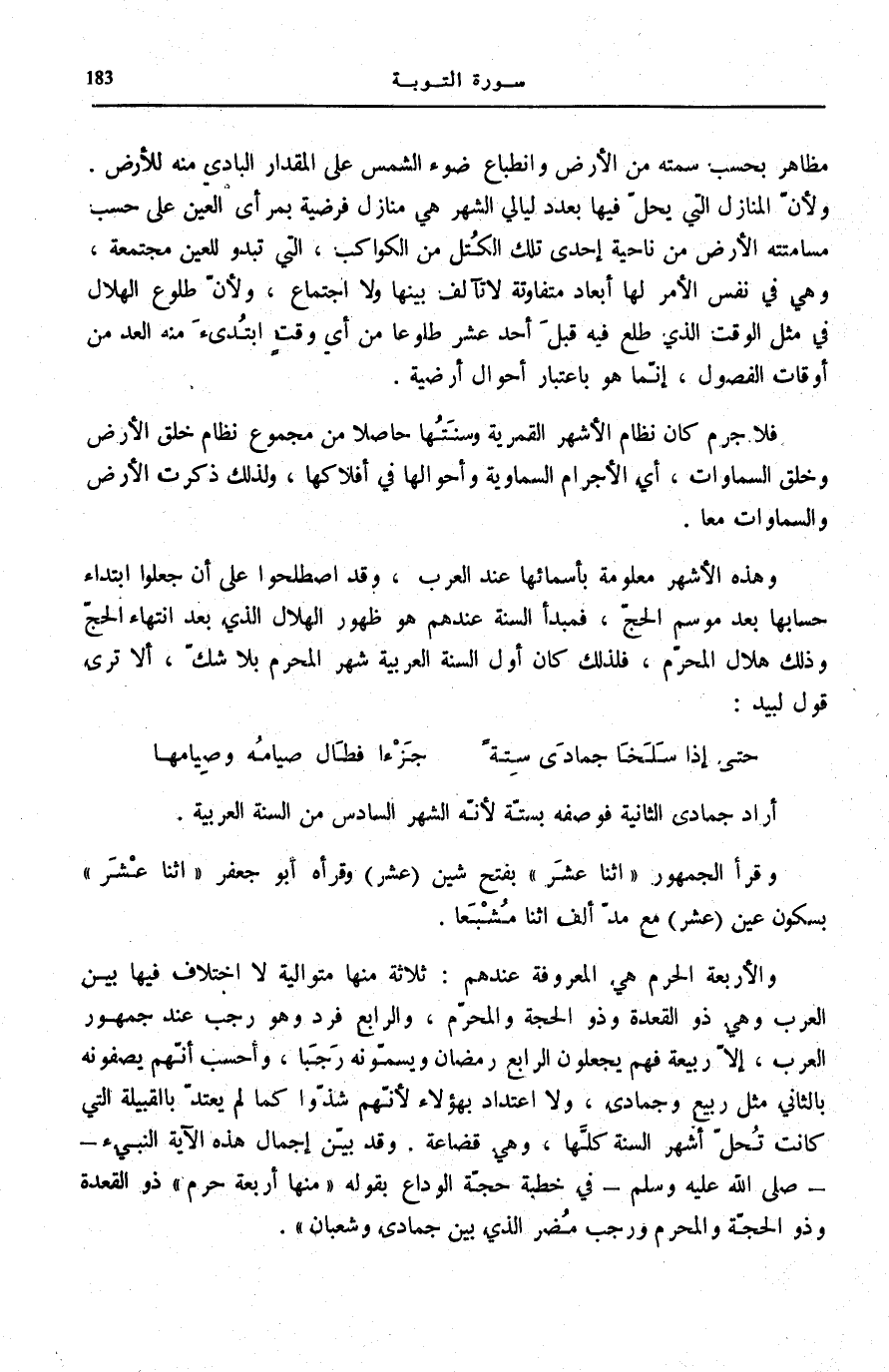 وَهَذِهِ الْأَشْهَرُ مَعْلُومَةٌ بِأَسْمَائِهَا عِنْدَ الْعَرَبِ، وَقَدِ اصْطَلَحُوا عَلَى أَنْ جَعَلُوا ابْتِدَاءَ حِسَابِهَا بَعْدَ مَوْسِمِ الْحَجِّ، فَمَبْدَأُ السُّنَّةِ عِنْدَهُمْ هُوَ ظُهُورُ الْهِلَالِ الَّذِي بَعْدَ انْتِهَاءِ الْحَجِّ وَذَلِكَ هِلَالُ الْمُحَرَّمِ، فَلِذَلِكَ كَانَ أَوَّلَ السَّنَةِ الْعَرَبِيَّةِ شَهْرُ الْمُحَرَّمِ بِلَا شَكٍّ، أَلَا تَرَى قَوْلَ لَبِيَدٍ: