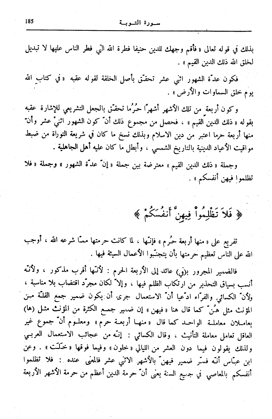 فَالضَّمِير الْمَجْرُور بفي عَائِدٌ إِلَى الْأَرْبَعَةِ الْحُرُمِ: لِأَنَّهَا أَقْرَبُ مَذْكُورٍ، وَلِأَنَّهُ أَنْسَبُ بِسِيَاقِ التَّحْذِيرِ مِنِ ارْتِكَابِ الظُّلْمِ فِيهَا، وَإِلَّا لَكَانَ مُجَرَّدُ اقْتِضَابٍ بِلَا مُنَاسِبَةٍ، وَلِأَنَّ الْكِسَائِيَّ وَالْفَرَّاءَ ادَّعَيَا أَنَّ الِاسْتِعْمَالَ جَرَى أَنْ يَكُونَ ضَمِيرُ جَمْعِ الْقِلَّةِ مِنَ الْمُؤَنَّثِ مِثْلَ هُنَّ كَمَا قَالَ هُنَا فِيهِنَّ إِنَّ ضَمِيرَ جَمْعِ الْكَثْرَةِ مِنَ الْمُؤَنَّثِ مِثْلَ (هَا) يُعَامَلَانِ مُعَامَلَةَ الْوَاحِدِ كَمَا قَالَ: مِنْها أَرْبَعَةٌ حُرُمٌ وَمَعْلُومٌ أَنَّ جُمُوعَ غَيْرِ الْعَاقِلِ تُعَامَلُ مُعَامَلَةَ التَّأْنِيثِ، وَقَالَ الْكِسَائِيُّ: إِنَّهُ مِنْ عَجَائِبِ الِاسْتِعْمَالِ الْعَرَبِيِّ وَلِذَلِكَ يَقُولُونَ فِيمَا دُونَ الْعَشْرِ مِنَ اللَّيَالِي «خَلَوْنَ» وَفِيمَا فَوْقَهَا «خَلَتْ» . وَعَنِ ابْنِ عَبَّاسٍ أَنَّهُ فَسَّرَ ضَمِيرَ فِيهِنَّ بِالْأَشْهُرِ الِاثْنَيْ عَشَرَ فَالْمَعْنَى عِنْدَهُ: فَلَا تَظْلِمُوا أَنْفُسَكُمْ بِالْمَعَاصِي فِي جَمِيعِ السَّنَةِ يَعْنِي أَنَّ حُرْمَةَ الدِّينِ أَعْظَمُ مِنْ حُرْمَةِ الْأَشْهُرِ الْأَرْبَعَةِ