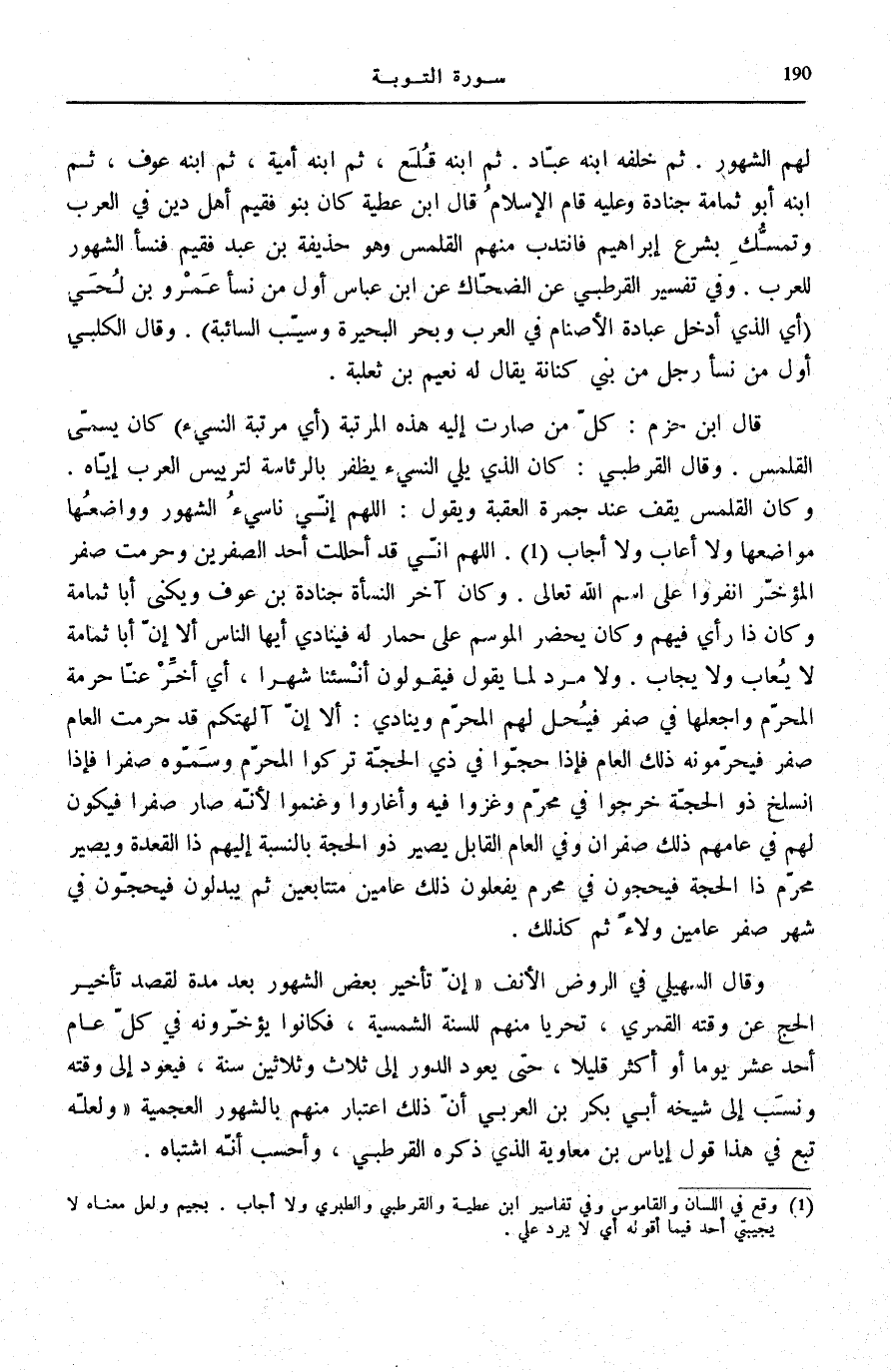 لَهُمُ الشُّهُورَ. ثُمَّ خَلَفَهُ ابْنُهُ عَبَّادٌ. ثُمَّ ابْنُهُ قُلَعٌ، ثُمَّ ابْنُهُ أُمَيَّةُ، ثُمَّ ابْنُهُ عَوْفٌ، ثُمَّ ابْنُهُ أَبُو ثُمَامَةَ جُنَادَةُ وَعَلَيْهِ قَامَ الْإِسْلَامُ قَالَ ابْنُ عَطِيَّةَ كَانَ بَنُو فُقَيْمٍ أَهْلَ دِينٍ فِي الْعَرَبِ وَتَمَسُّكٍ بِشَرْعِ إِبْرَاهِيمَ فَانْتَدَبَ مِنْهُمُ الْقَلَمَّسُ وَهُوَ حُذَيْفَةُ بْنُ عَبْدِ فُقَيْمٍ فَنَسَأَ الشُّهُورَ لِلْعَرَبِ. وَفِي «تَفْسِيرِ الْقُرْطُبِيِّ» عَنِ الضَّحَّاكِ عَنِ ابْنِ عَبَّاسٍ أَوَّلُ مَنْ نَسَأَ عَمْرُو بْنُ لُحَيٍّ (أَيِ الَّذِي أَدْخَلَ عِبَادَةَ الْأَصْنَامِ فِي الْعَرَبِ وَبَحَرَ الْبَحِيرَةَ وَسَيَّبَ السَّائِبَةَ) . وَقَالَ الْكَلْبِيُّ أَوَّلُ مَنْ نَسَأَ رَجُلٌ مِنْ بَنِي كِنَانَةَ يُقَالُ لَهُ نُعَيْمُ بْنُ ثَعْلَبَةَ.