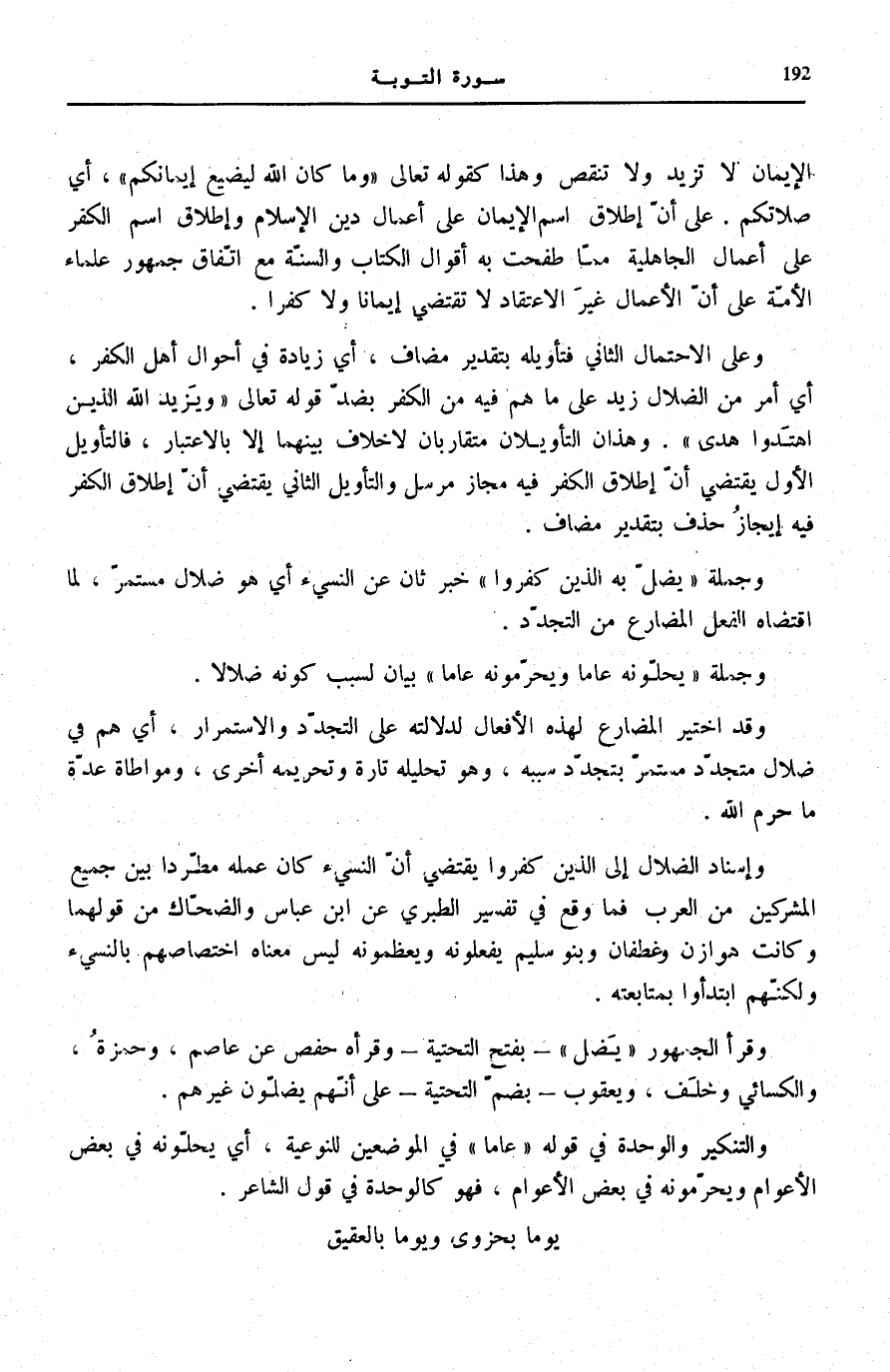 الْإِيمَانِ لَا تَزِيدُ وَلَا تَنْقُصُ وَهَذَا كَقَوْلِهِ تَعَالَى: وَما كانَ اللَّهُ لِيُضِيعَ إِيمانَكُمْ [الْبَقَرَة: 143] ، أَيْ صَلَاتَكُمْ. عَلَى أَنَّ إِطْلَاقَ اسْمِ الْإِيمَانِ عَلَى أَعْمَالِ دِينِ الْإِسْلَامِ وَإِطْلَاقَ اسْمِ الْكُفْرِ عَلَى أَعْمَالِ الْجَاهِلِيَّةِ مِمَّا طَفَحَتْ بِهِ أَقْوَالُ الْكِتَابِ وَالسُّنَّةِ مَعَ اتِّفَاقِ جُمْهُورِ عُلَمَاءِ الْأُمَّةِ عَلَى أَنَّ الْأَعْمَالَ غَيْرُ الِاعْتِقَادِ لَا تَقْتَضِي إِيمَانًا وَلَا كُفْرًا.