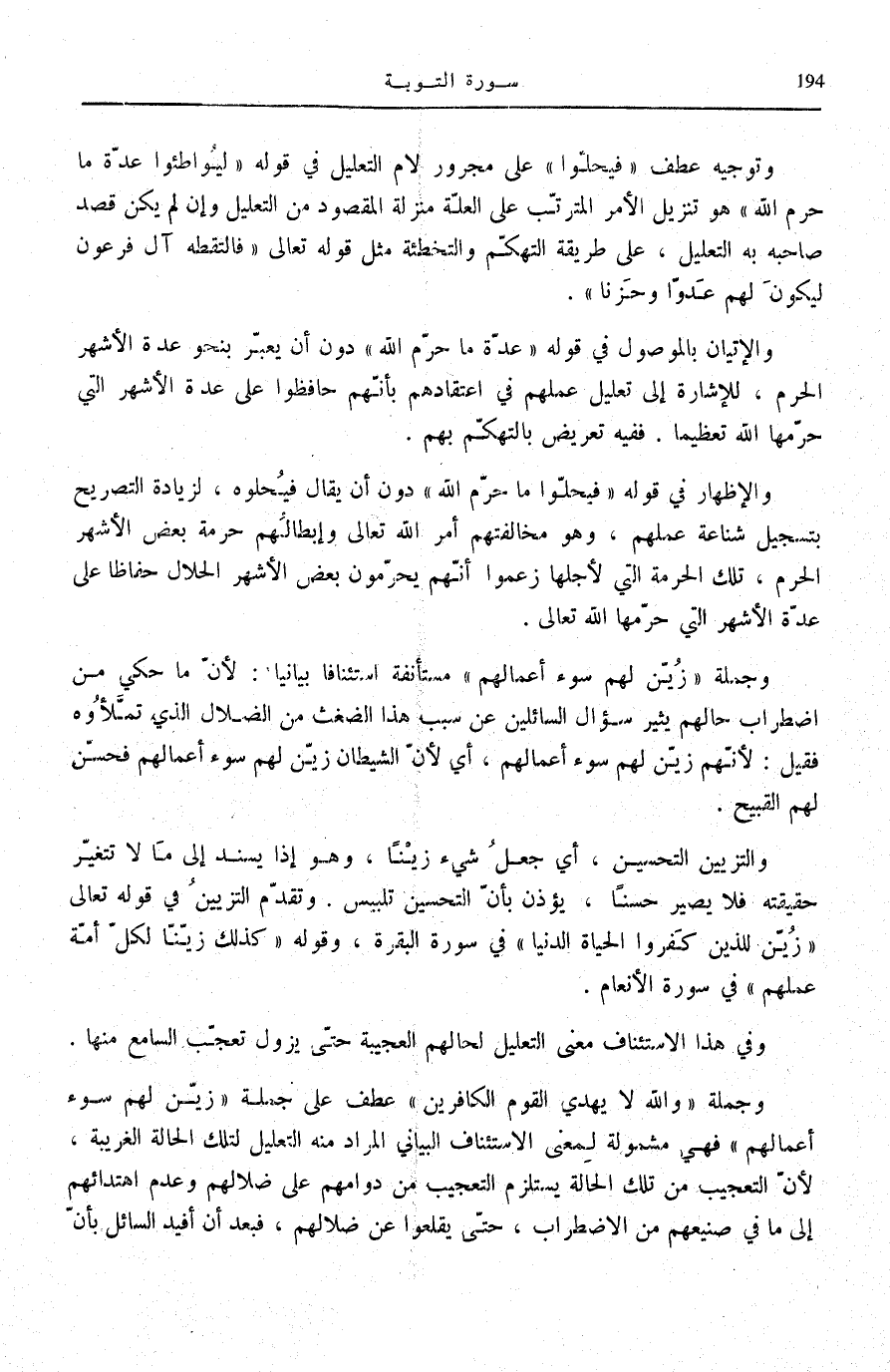 وَالْإِتْيَانُ بِالْمَوْصُولِ فِي قَوْلِهِ: عِدَّةَ مَا حَرَّمَ اللَّهُ دُونَ أَنْ يُعَبِّرَ بِنَحْوِ عِدَّةِ الْأَشْهُرِ الْحُرُمِ، لِلْإِشَارَةِ إِلَى تَعْلِيلِ عَمَلِهِمْ فِي اعْتِقَادِهِمْ بِأَنَّهُمْ حَافَظُوا عَلَى عِدَّةِ الْأَشْهُرِ الَّتِي حَرَّمَهَا اللَّهُ تَعْظِيمًا. فَفِيهِ تَعْرِيضٌ بِالتَّهَكُّمِ بِهِمْ.