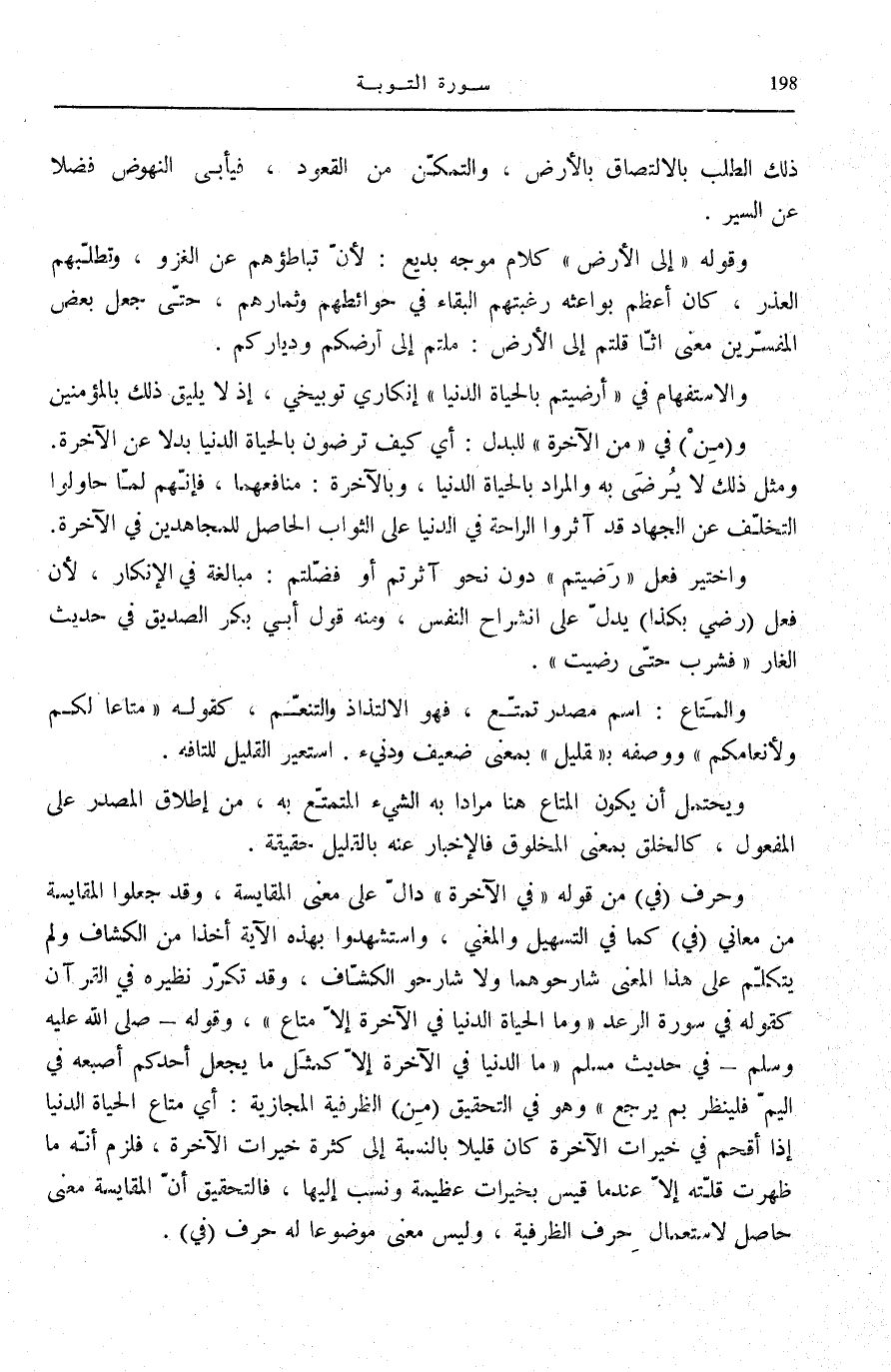 وَقَوْلُهُ: إِلَى الْأَرْضِ كَلَامٌ مُوَجَّهٌ بَدِيعٌ: لِأَنَّ تَبَاطُؤَهُمْ عَنِ الْغَزْوِ، وَتَطَلُّبَهُمُ الْعُذْرَ، كَانَ أَعْظَمُ بَوَاعِثِهِ رَغْبَتَهُمُ الْبَقَاءَ فِي حَوَائِطِهِمْ وَثِمَارِهِمْ، حَتَّى جَعَلَ بَعْضُ الْمُفَسِّرِينَ مَعْنَى اثَّاقَلْتُمْ إِلَى الْأَرْضِ: مِلْتُمْ إِلَى أَرْضِكُمْ وَدِيَارِكُمْ.
