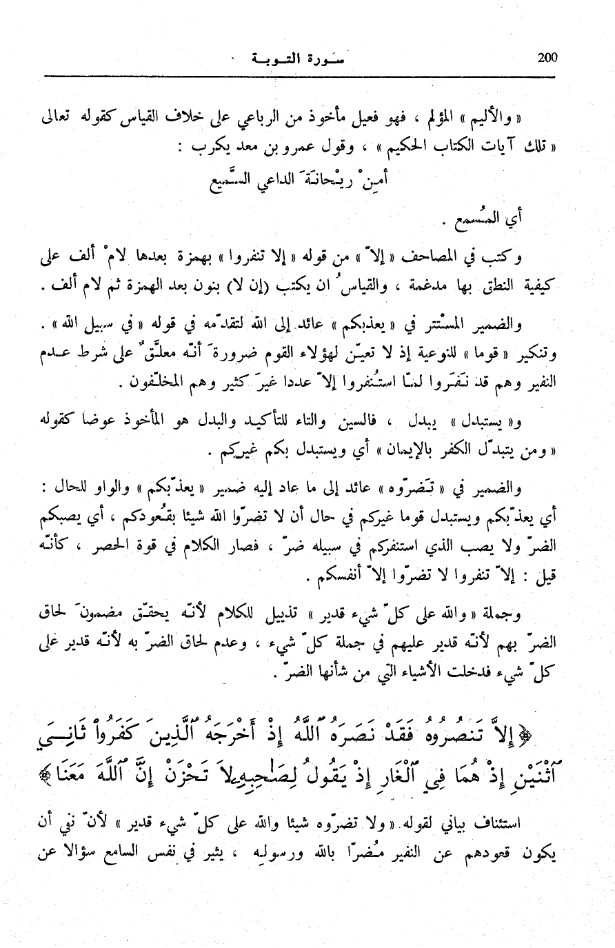 وَالضَّمِيرُ فِي تَضُرُّوهُ عَائِدٌ إِلَى مَا عَادَ إِلَيْهِ ضَمِيرُ يُعَذِّبْكُمْ وَالْوَاوُ لِلْحَالِ: أَيْ يُعَذِّبْكُمْ وَيَسْتَبْدِلْ قَوْمًا غَيْرَكُمْ فِي حَالِ أَنْ لَا تَضُرُّوا اللَّهَ شَيْئًا بِقُعُودِكُمْ، أَيْ يُصِبْكُمُ الضُّرُّ وَلَا يُصِبِ الَّذِي اسْتَنْفَرَكُمْ فِي سَبِيلِهِ ضُرٌّ، فَصَارَ الْكَلَامُ فِي قُوَّةِ الْحَصْرِ، كَأَنَّهُ قِيلَ: إِلَّا تَنْفِرُوا لَا تَضُرُّوا إِلَّا أَنْفُسَكُمْ.