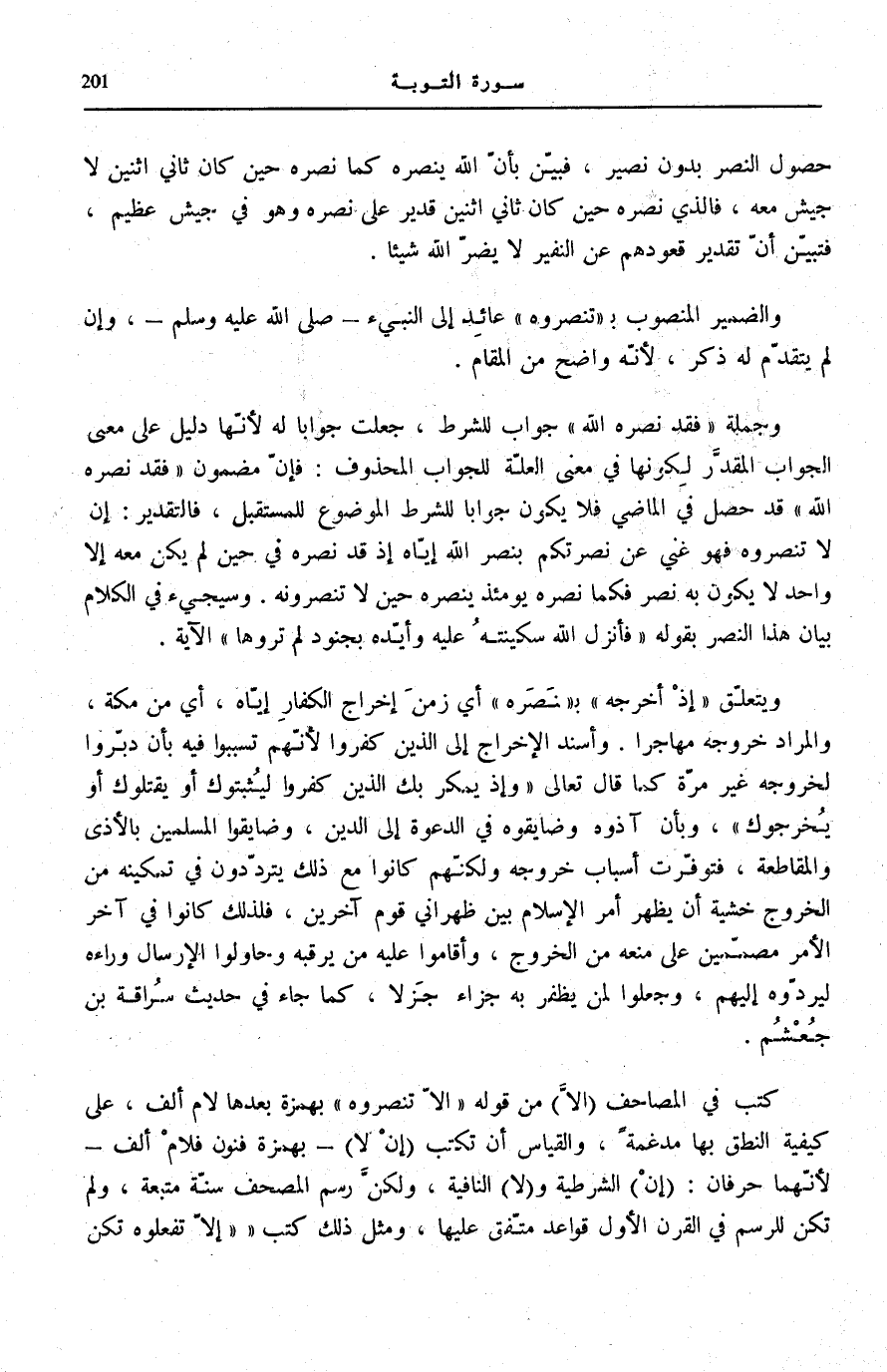 وَجُمْلَةُ فَقَدْ نَصَرَهُ اللَّهُ جَوَابٌ لِلشَّرْطِ، جُعِلَتْ جَوَابًا لَهُ لِأَنَّهَا دَلِيلٌ عَلَى مَعْنَى الْجَوَابِ الْمُقَدَّرِ لِكَوْنِهَا فِي مَعْنَى الْعِلَّةِ لِلْجَوَابِ الْمَحْذُوفِ: فَإِنَّ مَضْمُونَ فَقَدْ نَصَرَهُ اللَّهُ قَدْ حَصَلَ فِي الْمَاضِي فَلَا يَكُونُ جَوَابًا لِلشَّرْطِ الْمَوْضُوعِ لِلْمُسْتَقْبَلِ، فَالتَّقْدِيرُ: إِنْ لَا تَنْصُرُوهُ فَهُوَ غَنِيٌّ عَنْ نُصْرَتِكُمْ بِنَصْرِ اللَّهِ إِيَّاهُ إِذْ قَدْ نَصَرَهُ فِي حِينِ لَمْ يَكُنْ مَعَهُ إِلَّا وَاحِدٌ لَا يَكُونُ بِهِ نَصْرٌ فَكَمَا نَصَرَهُ يَوْمَئِذٍ يَنْصُرُهُ حِينَ لَا تَنْصُرُونَهُ. وَسَيَجِيءُ فِي الْكَلَامِ بَيَانُ هَذَا النَّصْرِ بِقَوْلِهِ: فَأَنْزَلَ اللَّهُ سَكِينَتَهُ عَلَيْهِ وَأَيَّدَهُ بِجُنُودٍ لَمْ تَرَوْها الْآيَةَ.