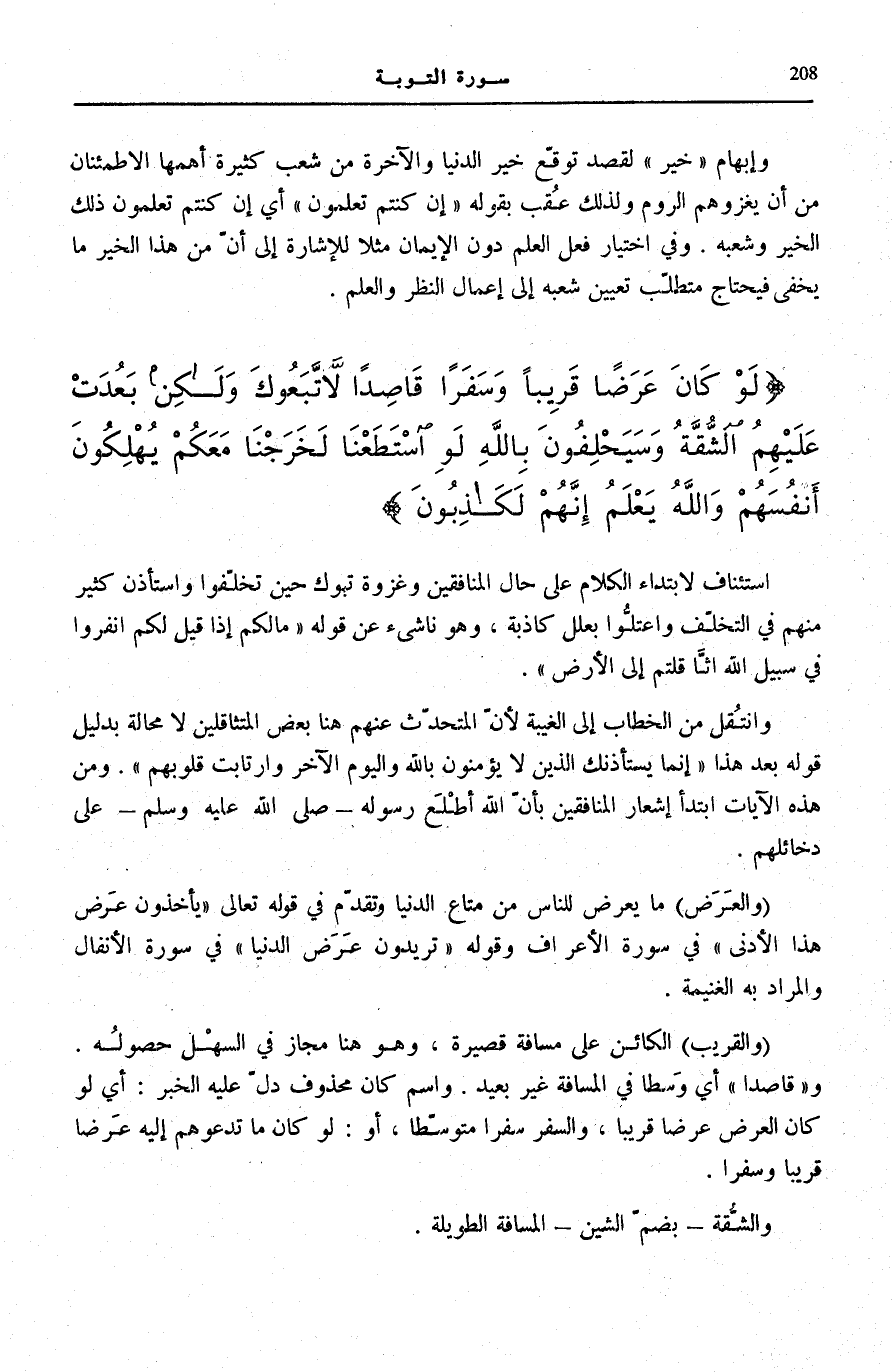 لَوْ كانَ عَرَضاً قَرِيباً وَسَفَراً قاصِداً لاتَّبَعُوكَ وَلكِنْ بَعُدَتْ عَلَيْهِمُ الشُّقَّةُ وَسَيَحْلِفُونَ بِاللَّهِ لَوِ اسْتَطَعْنا لَخَرَجْنا مَعَكُمْ يُهْلِكُونَ أَنْفُسَهُمْ وَاللَّهُ يَعْلَمُ إِنَّهُمْ لَكاذِبُونَ (42)