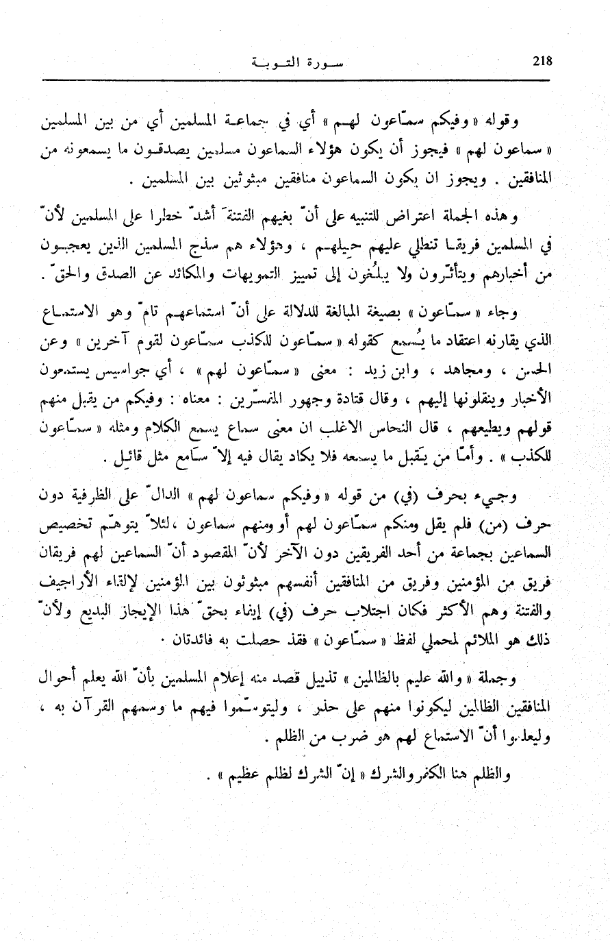 الْمُؤْمِنِينَ وَفَرِيقٌ مِنَ الْمُنَافِقِينَ أَنْفُسِهِمْ مَبْثُوثُونَ بَيْنَ الْمُؤْمِنِينَ لِإِلْقَاءِ الْأَرَاجِيفِ وَالْفِتْنَةِ وَهُمُ الْأَكْثَرُ فَكَانَ اجْتِلَابُ حَرْفِ (فِي) إِيفَاءً بِحَقِّ هَذَا الْإِيجَازِ الْبَدِيعِ وَلِأَنَّ ذَلِكَ هُوَ الْمُلَائِمُ لِمَحْمَلَيْ لَفَظِ سَمَّاعُونَ فَقَدْ حَصَلَتْ بِهِ فَائِدَتَانِ.