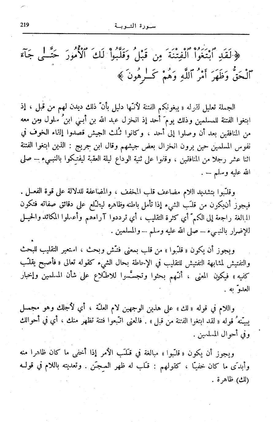 وَاللَّامُ فِي قَوْلِهِ: لَكَ عَلَى هَذَيْنِ الْوَجْهَيْنِ لَامُ الْعِلَّةِ، أَيْ لِأَجْلِكَ وَهُوَ مُجْمَلٌ يُبَيِّنُهُ قَوْلُهُ: لَقَدِ ابْتَغَوُا الْفِتْنَةَ مِنْ قَبْلُ [التَّوْبَة: 48] . فَالْمَعْنَى اتَّبَعُوا فِتْنَةً تَظْهَرُ مِنْكَ، أَيْ فِي أَحْوَالِكَ وَفِي أَحْوَالِ الْمُسْلِمِينَ.