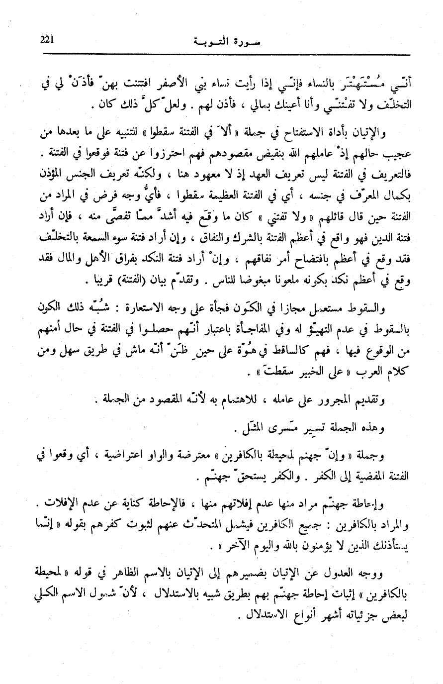 فَالتَّعْرِيفُ فِي الْفِتْنَةِ لَيْسَ تَعْرِيفَ الْعَهْدِ إِذْ لَا مَعْهُودَ هُنَا، وَلَكِنَّهُ تَعْرِيفُ الْجِنْسِ الْمُؤْذِنُ بِكَمَالِ الْمُعَرَّفِ فِي جِنْسِهِ، أَيْ فِي الْفِتْنَةِ الْعَظِيمَةِ سَقَطُوا، فَأَيُّ وَجْهٍ فُرِضَ فِي الْمُرَادِ مِنَ الْفِتْنَةِ حِينَ قَالَ قَائِلُهُمْ وَلا تَفْتِنِّي كَانَ مَا وَقَعَ فِيهِ أَشَدَّ مِمَّا تَفَصَّى مِنْهُ، فَإِنْ أَرَادَ فِتْنَةَ الدِّينِ فَهُوَ وَاقِعٌ فِي أَعْظَمِ الْفِتْنَةِ بِالشِّرْكِ وَالنِّفَاقِ، وَإِنْ أَرَادَ فِتْنَةَ سُوءِ السُّمْعَةِ بِالتَّخَلُّفِ فَقَدْ وَقَعَ فِي أَعْظَمَ بِافْتِضَاحِ أَمْرِ نِفَاقِهِمْ، وَإِنْ أَرَادَ فِتْنَةَ النَّكَدِ بِفِرَاقِ الْأَهْلِ وَالْمَالِ فَقَدْ وَقَعَ فِي أَعْظَمِ نَكَدٍ بِكَوْنِهِ مَلْعُونًا مَبْغُوضًا لِلنَّاسِ. وَتَقَدَّمَ بَيَانُ الْفِتْنَةِ قَرِيبًا.