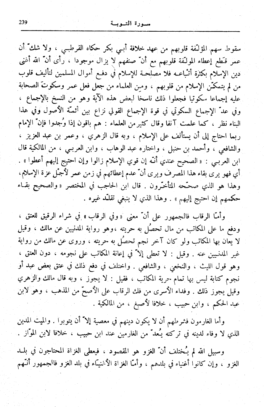 سُقُوطُ سَهْمِ الْمُؤَلَّفَةِ قُلُوبُهُمْ مِنْ عَهْدِ خِلَافَةِ أَبِي بَكْرٍ حَكَاهُ الْقُرْطُبِيُّ، وَلَا شَكَّ أَنَّ عُمَرَ قَطَعَ إِعْطَاءَ الْمُؤَلَّفَةِ قُلُوبُهُمْ مَعَ أَنَّ صِنْفَهُمْ لَا يَزَالُ مَوْجُودًا، رَأَى أَنَّ اللَّهَ أَغْنَى دِينَ الْإِسْلَامِ بِكَثْرَةِ أَتْبَاعِهِ فَلَا مَصْلَحَةَ لِلْإِسْلَامِ فِي دَفْعِ أَمْوَالِ الْمُسْلِمِينَ لِتَأْلِيفِ قُلُوبِ مَنْ لَمْ يَتَمَكَّنِ الْإِسْلَامُ مِنْ قُلُوبِهِمْ، وَمِنَ الْعُلَمَاءِ مَنْ جَعَلَ فِعْلَ عُمَرَ وَسُكُوتَ الصَّحَابَةِ عَلَيْهِ إِجْمَاعًا سُكُوتِيًّا فَجَعَلُوا ذَلِكَ نَاسِخًا لِبَعْضِ هَذِهِ الْآيَةِ وَهُوَ مِنَ النَّسْخِ بِالْإِجْمَاعِ، وَفِي عَدِّ الْإِجْمَاعِ السُّكُوتِيِّ فِي قُوَّةِ الْإِجْمَاعِ الْقَوْلِيِّ نِزَاعٌ بَيْنَ أَئِمَّةِ الْأُصُولِ وَفِي هَذَا الْبِنَاءِ نَظَرٌ، كَمَا عَلِمْتَ آنِفًا وَقَالَ كَثِيرٌ مِنَ الْعُلَمَاءِ: هُمْ بَاقُونَ إِذَا وُجِدُوا فَإِنَّ الْإِمَامَ رُبَّمَا احْتَاجَ إِلَى أَنْ يَسْتَأْلِفَ عَلَى الْإِسْلَامِ، وَبِهِ قَالَ الزُّهْرِيُّ، وَعُمَرُ بْنُ عَبْدِ الْعَزِيزِ، وَالشَّافِعِيُّ، وَأَحْمَدُ بْنُ حَنْبَلٍ، وَاخْتَارَهُ عَبْدُ الْوَهَّابِ، وَابْنُ الْعَرَبِيِّ، مِنَ الْمَالِكِيَّةِ قَالَ ابْنُ الْعَرَبِيِّ: «الصَّحِيحُ عِنْدِي أَنَّهُ إِنْ قَوِيَ الْإِسْلَامُ زَالُوا وَإِنِ احْتِيجَ إِلَيْهِمْ أُعْطُوا» . أَيْ فَهُوَ يَرَى بَقَاءَ هَذَا الْمَصْرِفِ وَيَرَى أَنَّ عَدَمَ إِعْطَائِهِمْ فِي زَمَنِ عُمَرَ لِأَجْلِ عِزَّةِ الْإِسْلَامِ، وَهَذَا هُوَ الَّذِي صَحَّحَهُ الْمُتَأَخِّرُونَ.