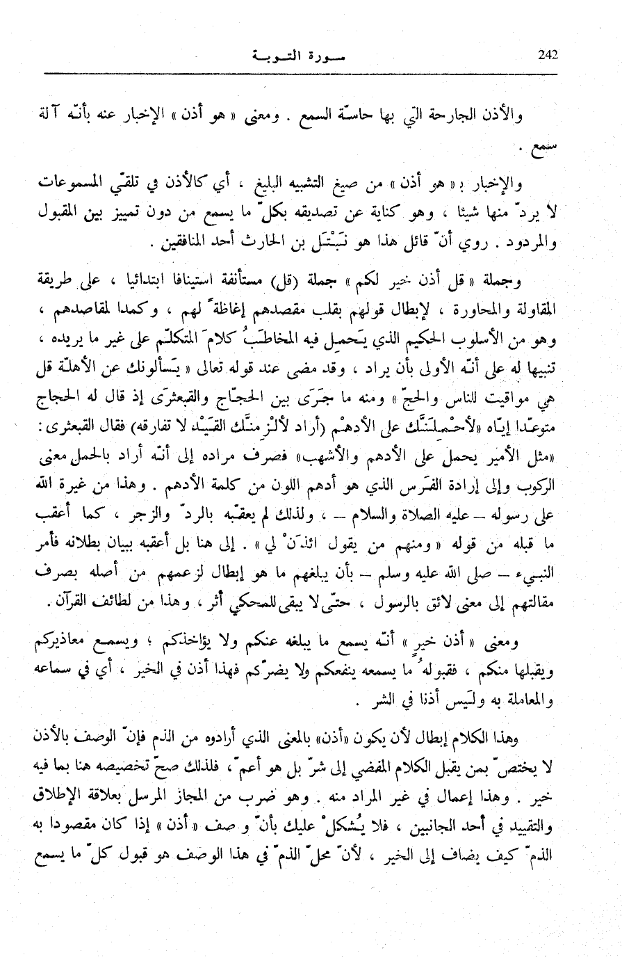 وَهَذَا الْكَلَامُ إِبْطَالٌ لِأَنْ يَكُونَ أُذُنٌ بِالْمَعْنَى الَّذِي أَرَادُوهُ مِنَ الذَّمِّ فَإِنَّ الْوَصْفَ بِالْأُذُنِ لَا يَخْتَصُّ بِمَنْ يَقْبَلُ الْكَلَامَ الْمُفْضِي إِلَى شَرٍّ بَلْ هُوَ أَعَمُّ، فَلِذَلِكَ صَحَّ تَخْصِيصُهُ هُنَا بِمَا فِيهِ خَيْرٌ. وَهَذَا إِعْمَالٌ فِي غَيْرِ الْمُرَادِ مِنْهُ. وَهُوَ ضَرْبٌ مِنَ الْمَجَازِ الْمُرْسَلِ بِعَلَاقَةِ الْإِطْلَاقِ وَالتَّقْيِيدِ فِي أَحَدِ الْجَانِبَيْنِ، فَلَا يُشْكِلُ عَلَيْكَ بِأَنَّ وَصْفَ أُذُنٌ إِذَا كَانَ مَقْصُودًا بِهِ الذَّمُّ كَيْفَ يُضَافُ إِلَى الْخَيْرِ، لِأَنَّ مَحَلَّ الذَّمِّ فِي هَذَا الْوَصْفِ هُوَ قَبُولُ كُلِّ مَا يَسْمَعُ