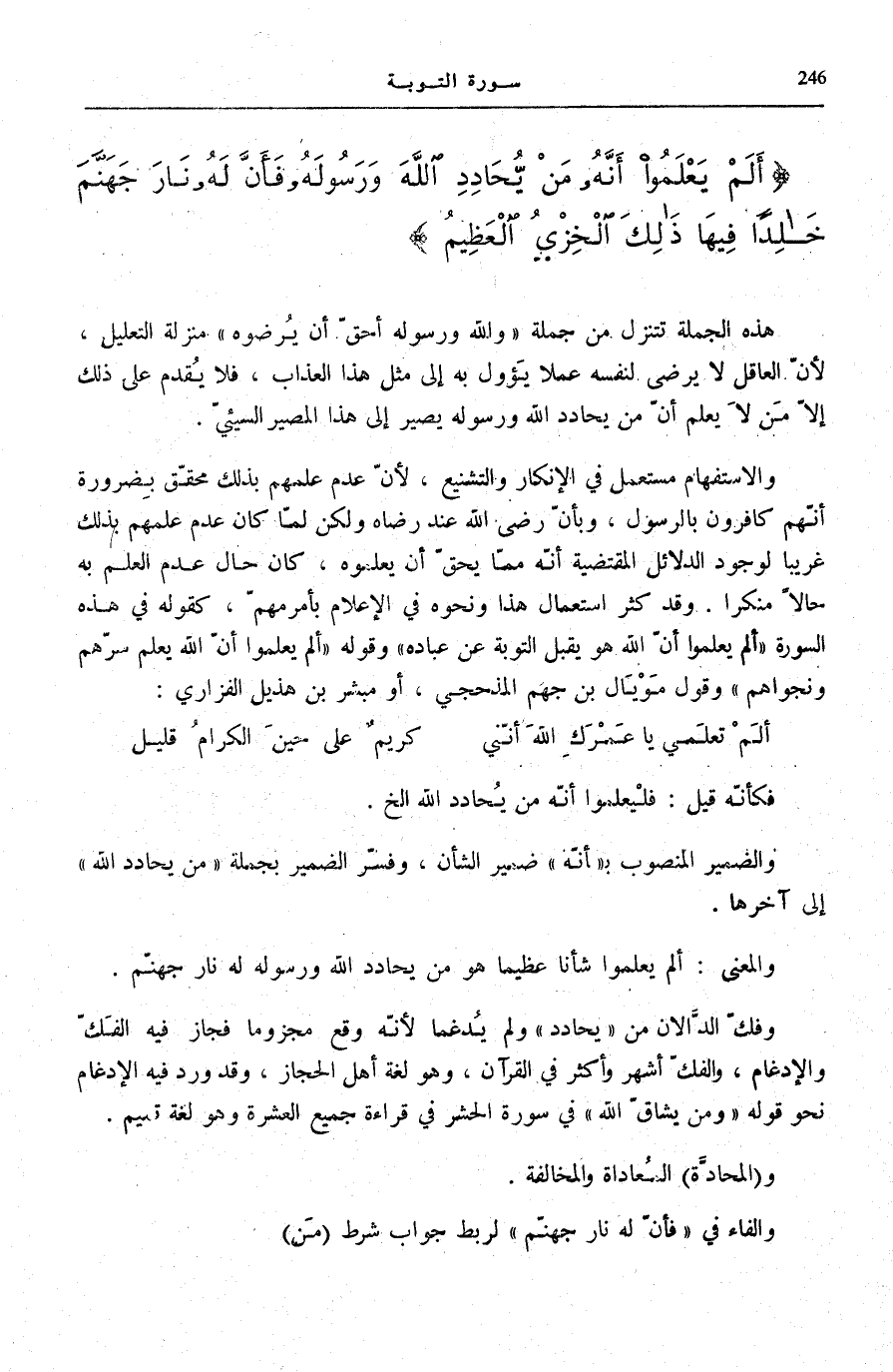 أَلَمْ يَعْلَمُوا أَنَّهُ مَنْ يُحادِدِ اللَّهَ وَرَسُولَهُ فَأَنَّ لَهُ نارَ جَهَنَّمَ خالِداً فِيها ذلِكَ الْخِزْيُ الْعَظِيمُ (63)