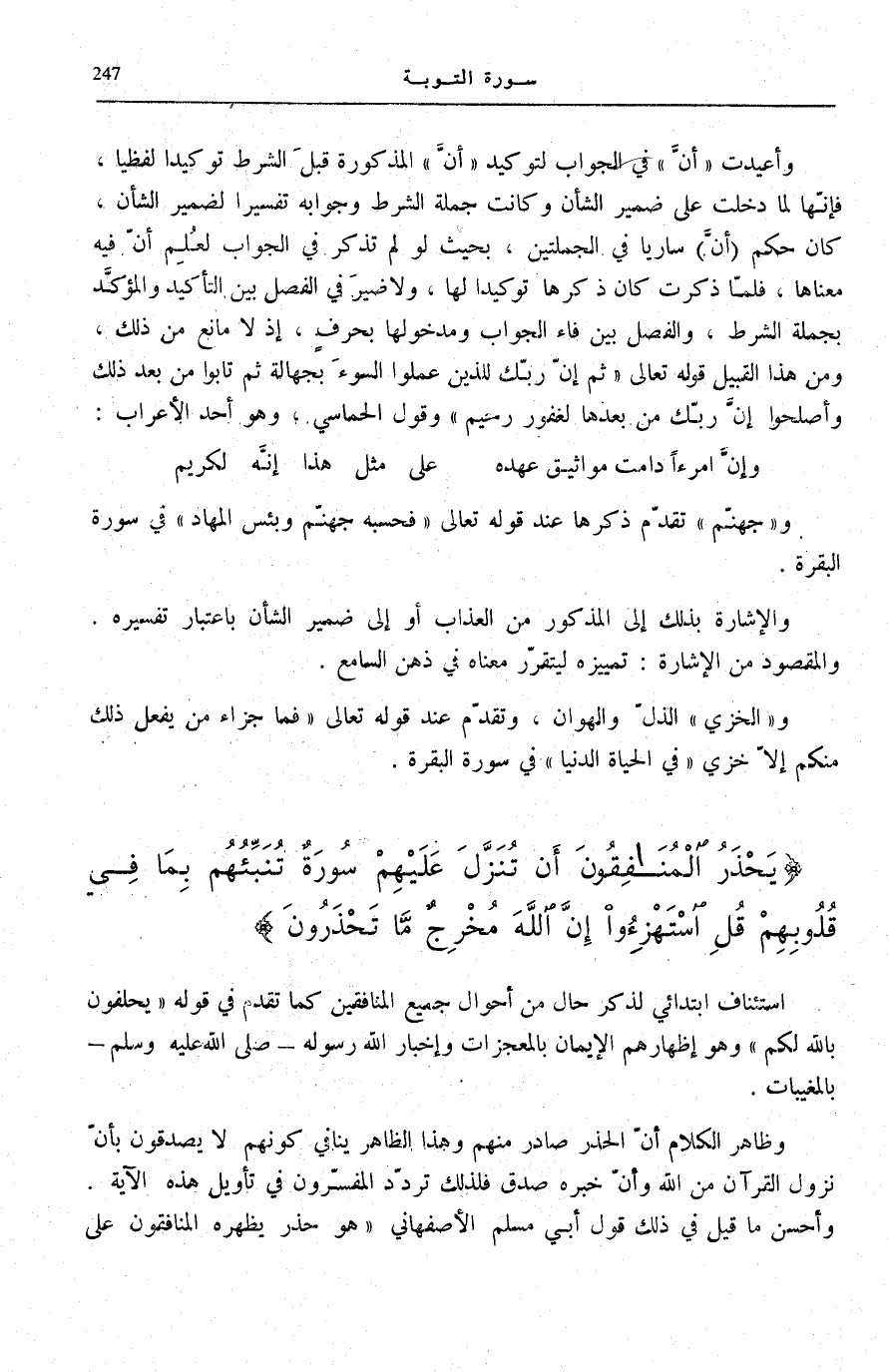 وَأُعِيدَتْ (َأَنَّ) فِي الْجَوَابِ لِتَوْكِيدِ أَنَّ الْمَذْكُورَةِ قَبْلَ الشَّرْطِ تَوْكِيدًا لَفْظِيًّا، فَإِنَّهَا لَمَّا دَخَلَتْ عَلَى ضَمِيرِ الشَّأْنِ وَكَانَتْ جُمْلَةُ الشَّرْطِ وَجَوَابُهُ تَفْسِيرًا لِضَمِيرِ الشَّأْنِ، كَانَ حُكْمُ أَنْ سَارِيًا فِي الْجُمْلَتَيْنِ بِحَيْثُ لَوْ لَمْ تُذْكَرْ فِي الْجَوَابِ لَعُلِمَ أَنَّ فِيهِ مَعْنَاهَا، فَلَمَّا ذُكِرَتْ كَانَ ذِكْرُهَا تَوْكِيدًا لَهَا، وَلَا ضَيْرَ فِي الْفَصْلِ بَيْنَ التَّأْكِيدِ وَالْمُؤَكَّدِ بِجُمْلَةِ الشَّرْطِ، وَالْفَصْلِ بَيْنَ فَاءِ الْجَوَابِ وَمَدْخُولِهَا بِحَرْفٍ، إِذْ لَا مَانِعَ مِنْ ذَلِكَ، وَمِنْ هَذَا الْقَبِيلِ قَوْلُهُ تَعَالَى: