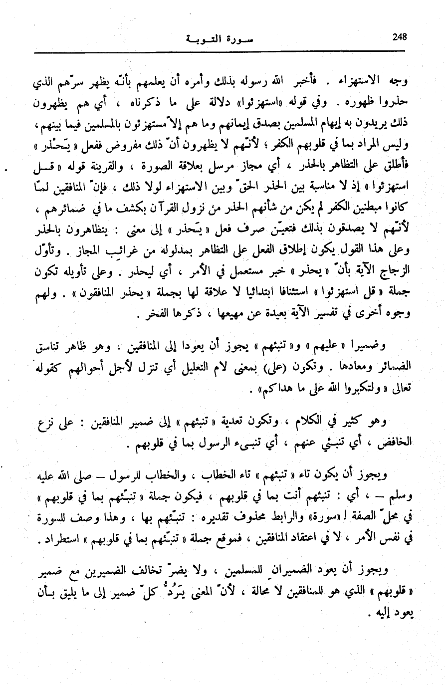 وَعَلَى تَأْوِيلِهِ تَكُونُ جملَة قُلِ اسْتَهْزِؤُا اسْتِئْنَافًا ابْتِدَائِيًّا لَا عَلَاقَةَ لَهَا بِجُمْلَةِ يَحْذَرُ الْمُنافِقُونَ. وَلَهُمْ وُجُوهٌ أُخْرَى فِي تَفْسِيرِ الْآيَةِ بَعِيدَةٌ عَنْ مَهْيَعِهَا، ذَكَرَهَا الْفَخْرُ.