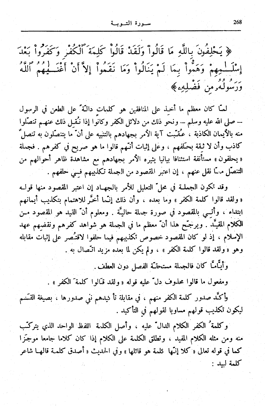 يَحْلِفُونَ بِاللَّهِ مَا قالُوا وَلَقَدْ قالُوا كَلِمَةَ الْكُفْرِ وَكَفَرُوا بَعْدَ إِسْلامِهِمْ وَهَمُّوا بِما لَمْ يَنالُوا وَما نَقَمُوا إِلَّا أَنْ أَغْناهُمُ اللَّهُ وَرَسُولُهُ مِنْ فَضْلِهِ.