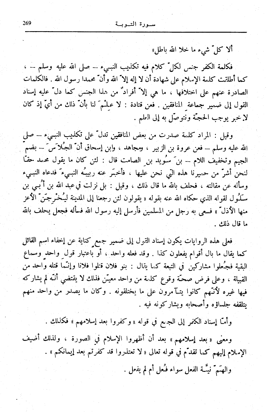 . فَكَلِمَةُ الْكُفْرِ جِنْسٌ لِكُلِّ كَلَامٍ فِيهِ تَكْذِيبُ النَّبِيءِ صَلَّى اللهُ عَلَيْهِ وَسَلَّمَ، كَمَا أُطْلِقَتْ كَلِمَةُ الْإِسْلَامِ عَلَى شَهَادَةِ أَنْ لَا إِلَهَ إِلَّا اللَّهُ وَأَنَّ مُحَمَّدًا رَسُولُ اللَّهِ. فَالْكَلِمَاتُ الصَّادِرَةُ عَنْهُمْ عَلَى اخْتِلَافِهَا، مَا هِيَ إِلَّا أَفْرَادٌ مِنْ هَذَا الْجِنْسِ كَمَا دَلَّ عَلَيْهِ إِسْنَادُ الْقَوْلِ إِلَى ضَمِيرِ جَمَاعَةِ الْمُنَافِقِينَ.