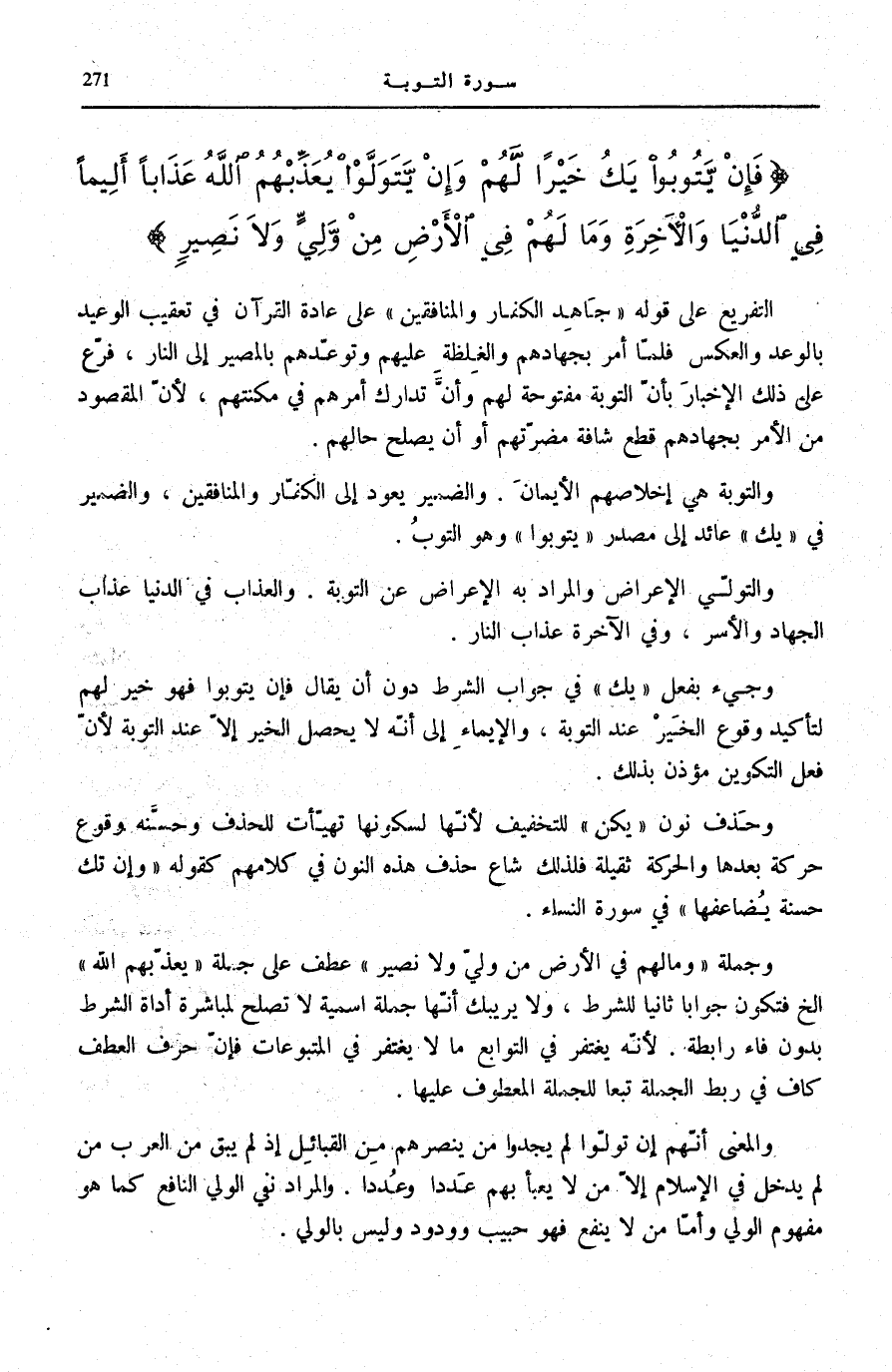 فَإِنْ يَتُوبُوا يَكُ خَيْراً لَهُمْ وَإِنْ يَتَوَلَّوْا يُعَذِّبْهُمُ اللَّهُ عَذاباً أَلِيماً فِي الدُّنْيا وَالْآخِرَةِ وَما لَهُمْ فِي الْأَرْضِ مِنْ وَلِيٍّ وَلا نَصِيرٍ.