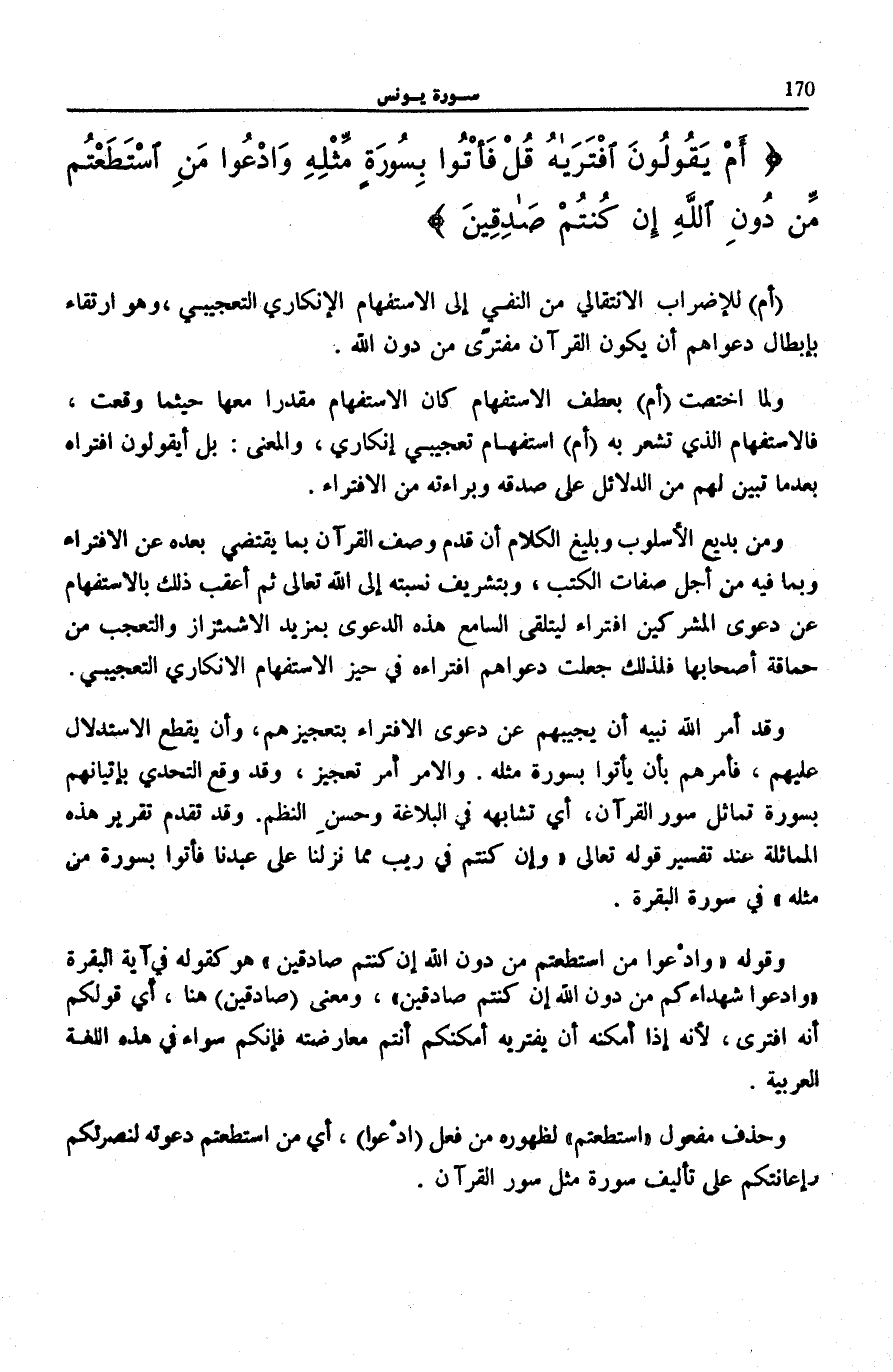 أَمْ يَقُولُونَ افْتَراهُ قُلْ فَأْتُوا بِسُورَةٍ مِثْلِهِ وَادْعُوا مَنِ اسْتَطَعْتُمْ مِنْ دُونِ اللَّهِ إِنْ كُنْتُمْ صادِقِينَ (38)