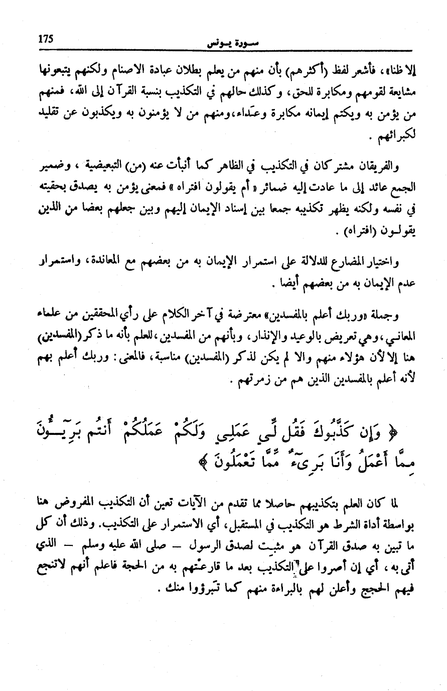 وَالْفَرِيقَانِ مُشْتَرِكَانِ فِي التَّكْذِيبِ فِي الظَّاهِرِ كَمَا أَنْبَأَتْ عَنْهُ (مِنِ) التَّبْعِيضِيَّةُ، وَضَمِيرُ الْجَمْعِ عَائِدٌ إِلَى مَا عَادَتْ إِلَيْهِ ضَمَائِرُ أَمْ يَقُولُونَ افْتَراهُ [يُونُس: 38] فَمَعْنَى يُؤْمِنُ بِهِ يصدق بحقيقته فِي نَفْسِهِ وَلَكِنَّهُ يَظْهَرُ تَكْذِيبُهُ جَمْعًا بَيْنَ إِسْنَادِ الْإِيمَانِ إِلَيْهِمْ وَبَيْنَ جَعْلِهِمْ بَعْضًا مِنَ الَّذِينَ يَقُولُونَ افْتَراهُ.