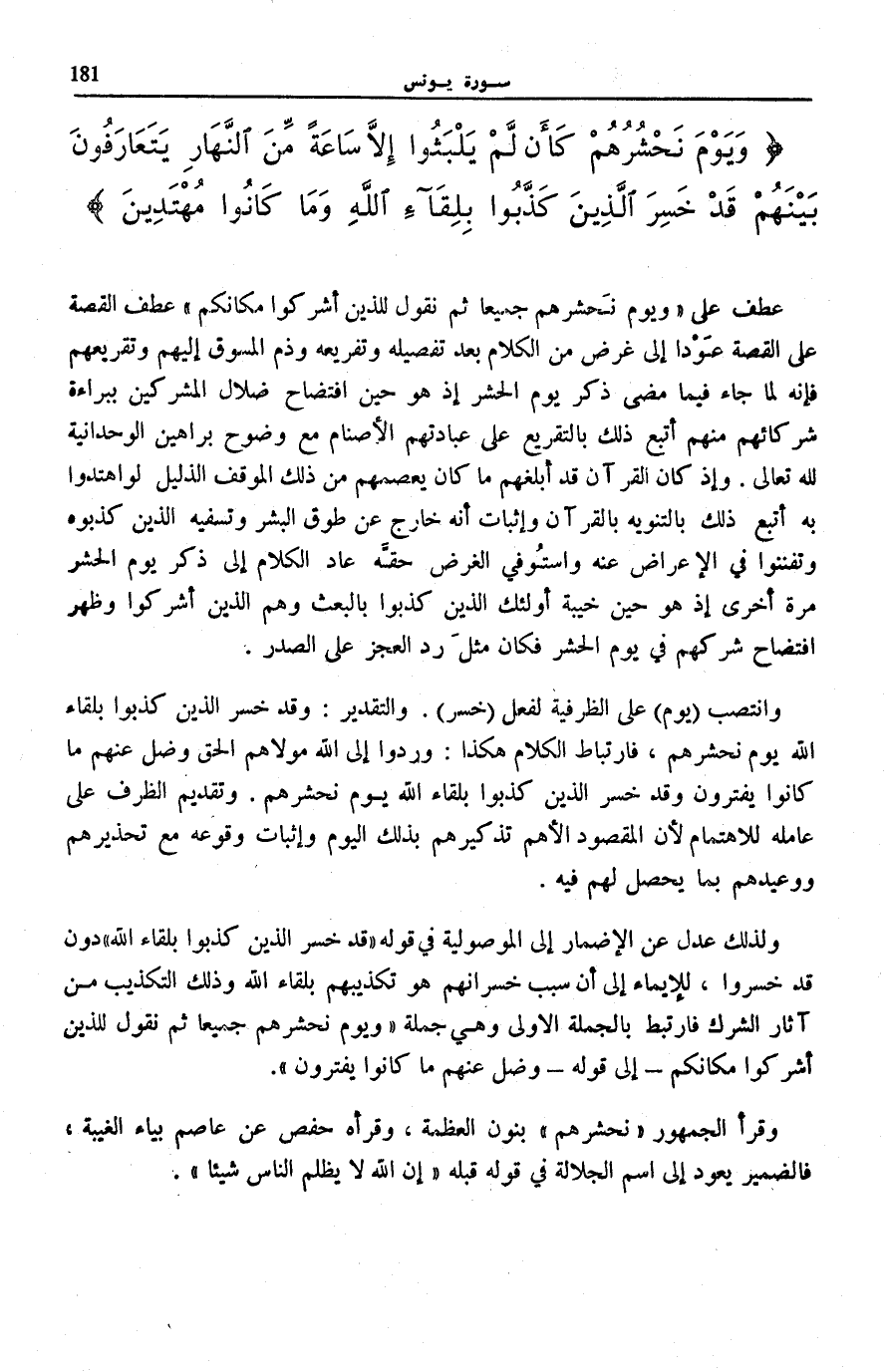 وَانْتَصَبَ يَوْمَ عَلَى الظَّرْفِيَّةِ لِفِعْلِ خَسِرَ. وَالتَّقْدِيرُ: وَقَدْ خَسِرَ الَّذِينَ كَذَّبُوا بِلِقَاءِ اللَّهِ يَوْمَ نَحْشُرُهُمْ، فَارْتِبَاطُ الْكَلَامِ هَكَذَا: وَرُدُّوا إِلَى اللَّهِ مَوْلَاهُمُ الْحَقِّ وَضَلَّ عَنْهُمْ مَا كَانُوا يَفْتَرُونَ وَقَدْ خَسِرَ الَّذِينَ كَذَّبُوا بِلِقَاءِ اللَّهِ يَوْمَ نَحْشُرُهُمْ. وَتَقْدِيمُ الظَّرْفِ عَلَى عَامِلِهِ لِلِاهْتِمَامِ لِأَنَّ الْمَقْصُودَ الْأَهَمَّ تَذْكِيرُهُمْ بِذَلِكَ الْيَوْمِ وَإِثْبَاتُ وُقُوعِهِ مَعَ تَحْذِيرِهِمْ وَوَعِيدِهِمْ بِمَا يَحْصُلُ لَهُمْ فِيهِ.
