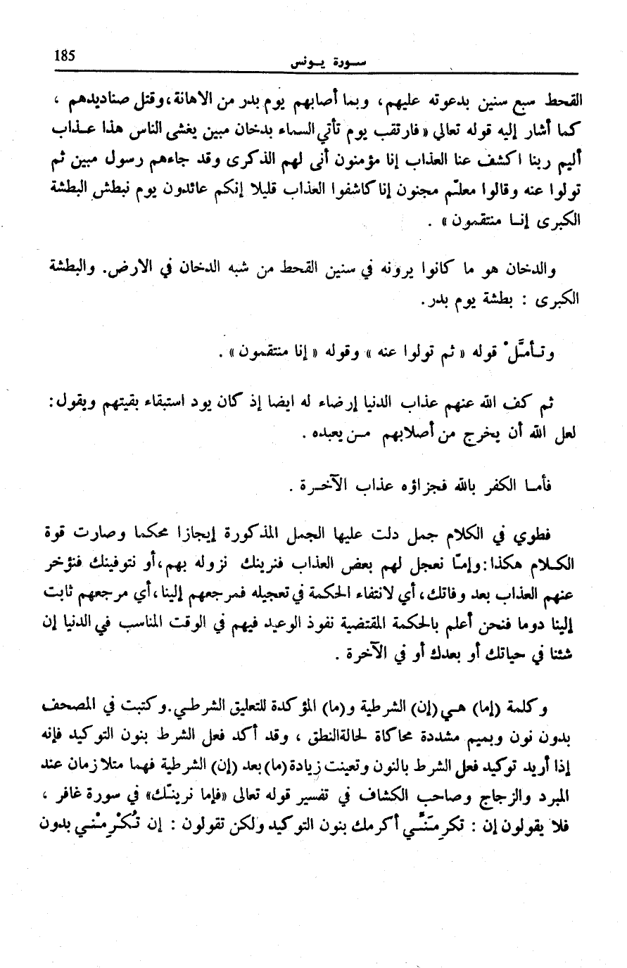 وَالدُّخَانُ هُوَ مَا كَانُوا يَرَوْنَهُ فِي سِنِينِ الْقَحْطِ مِنْ شَبَهِ الدُّخَانِ فِي الْأَرْضِ. وَالْبَطْشَةُ الْكُبْرَى: بَطْشَةُ يَوْمِ بَدْرٍ.