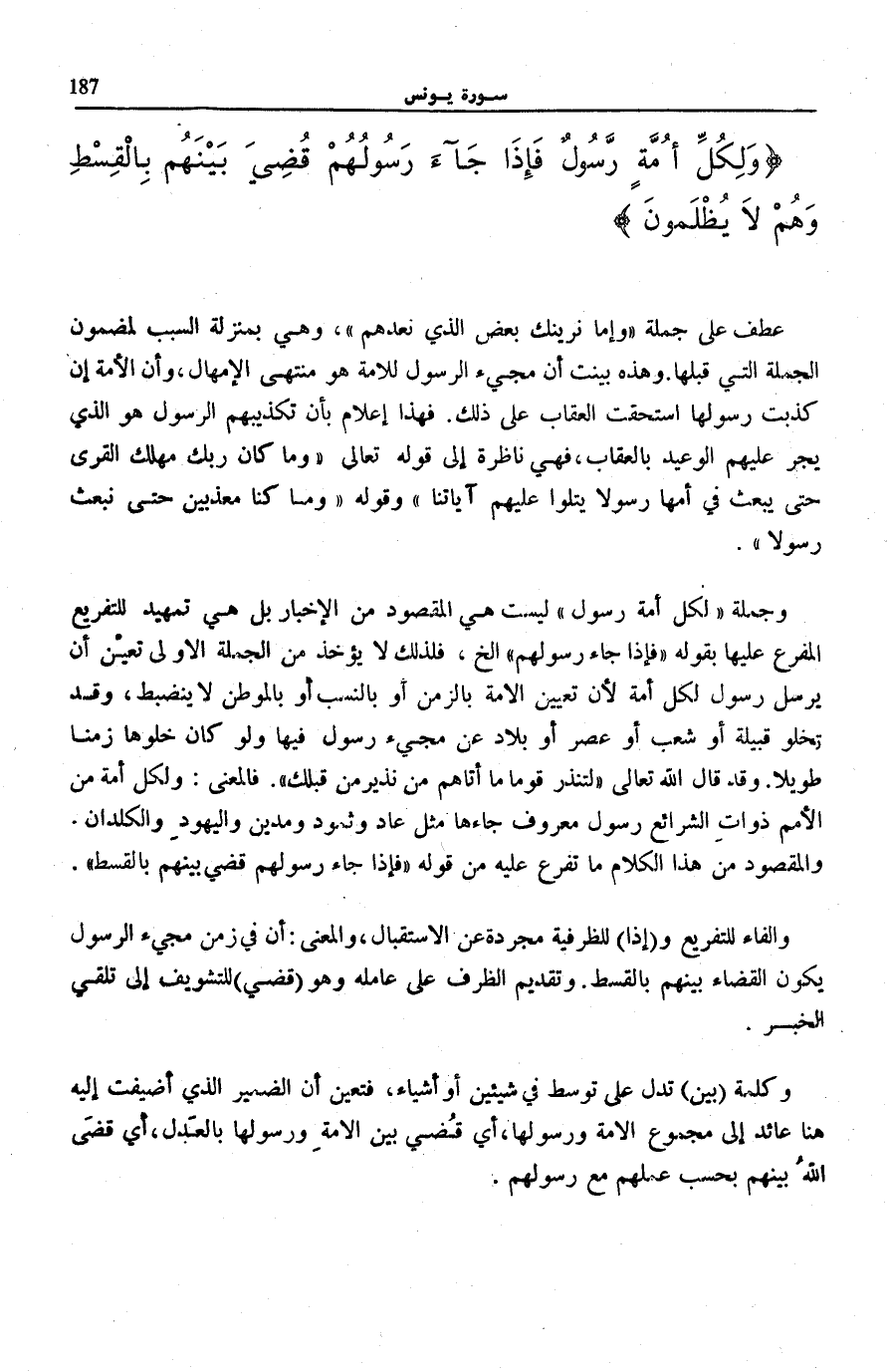 وَجُمْلَةُ: لِكُلِّ أُمَّةٍ رَسُولٌ لَيْسَتْ هِيَ الْمَقْصُودُ مِنَ الْإِخْبَارِ بَلْ هِيَ تَمْهِيدٌ لِلتَّفْرِيعِ الْمُفَرَّعِ عَلَيْهَا بِقَوْلِهِ: فَإِذا جاءَ رَسُولُهُمْ إِلَخْ، فَلِذَلِكَ لَا يُؤْخَذُ مِنَ الْجُمْلَةِ الْأَوْلَى تَعَيُّنُ أَنْ يُرْسَلَ رَسُولٌ لِكُلِّ أُمَّةٍ لِأَنَّ تَعْيِينَ الْأُمَّةِ بِالزَّمَنِ أَوْ بِالنَّسَبِ أَوْ بِالْمَوْطِنِ لَا يَنْضَبِطُ، وَقَدْ تَخْلُو قَبِيلَةٌ أَوْ شَعْبٌ أَوْ عَصْرٌ أَوْ بِلَادٌ عَنْ مَجِيءِ رَسُولٍ فِيهَا وَلَوْ كَانَ خُلُوُّهَا زَمَنًا طَوِيلًا.