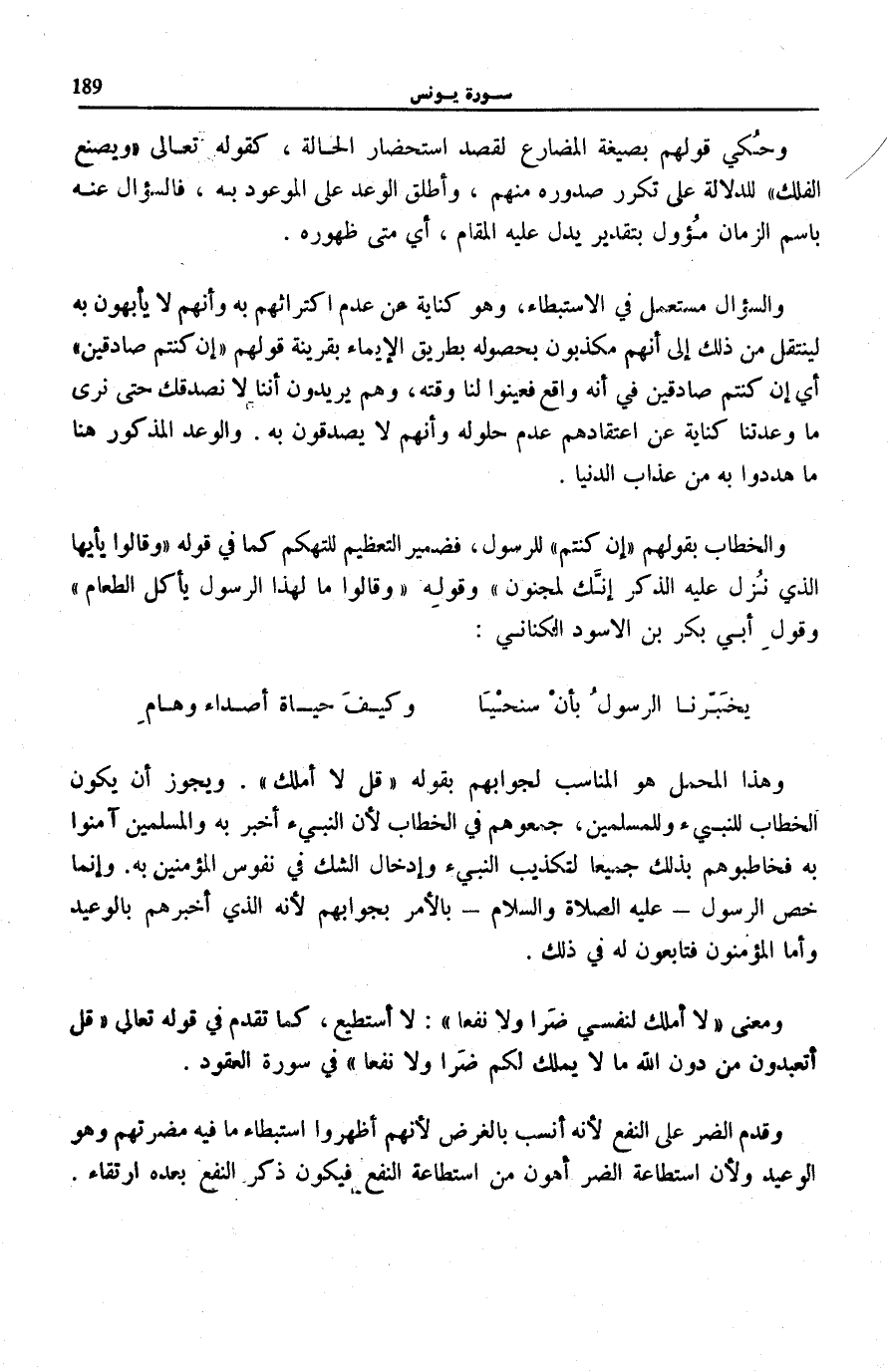 وَهَذَا الْمَحْمَلُ هُوَ الْمُنَاسِبُ لِجَوَابِهِمْ بِقَوْلِهِ: قُلْ لَا أَمْلِكُ. وَيَجُوزُ أَنْ يَكُونَ الْخِطَابُ لِلنَّبِيءِ وَلِلْمُسْلِمِينَ، جَمَعُوهُمْ فِي الْخِطَابِ لِأَنَّ النَّبِيءَ أَخْبَرَ بِهِ وَالْمُسْلِمِينَ آمَنُوا بِهِ فَخَاطَبُوهُمْ بِذَلِكَ جَمِيعًا لِتَكْذِيبِ النَّبِيءِ وَإِدْخَالِ الشَّكِّ فِي نُفُوسِ الْمُؤْمِنِينَ بِهِ. وَإِنَّمَا خُصَّ الرَّسُولُ- عَلَيْهِ الصَّلَاةُ وَالسَّلَامُ- بِالْأَمْرِ بِجَوَابِهِمْ لِأَنَّهُ الَّذِي أَخْبَرَهُمْ بِالْوَعِيدِ وَأَمَّا الْمُؤْمِنُونَ فَتَابِعُونَ لَهُ فِي ذَلِكَ.