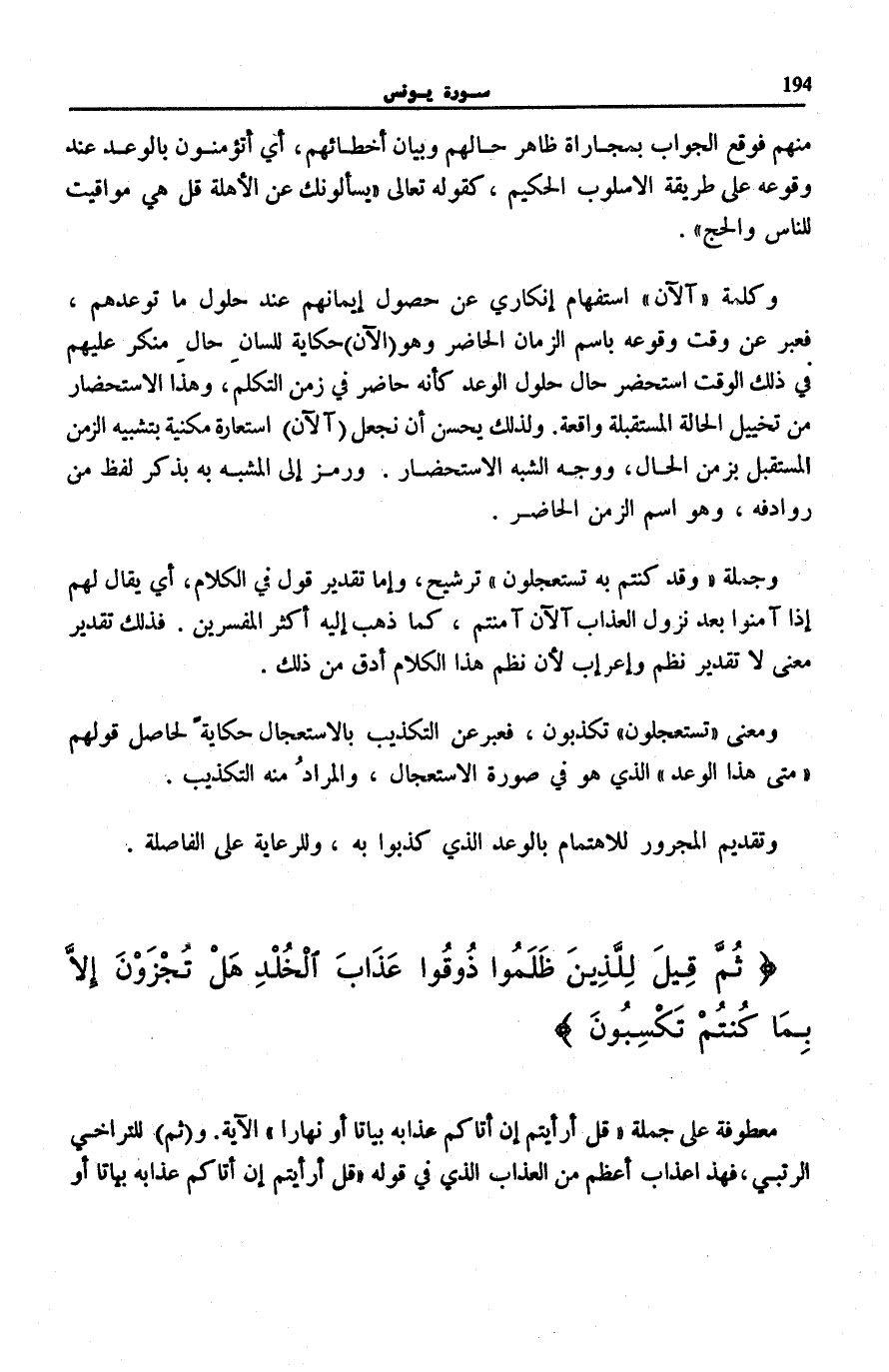 وَكَلِمَةُ آلْآنَ اسْتِفْهَامٌ إِنْكَارِيٌّ عَنْ حُصُولِ إِيمَانِهِمْ عِنْدَ حُلُولِ مَا تَوَعَّدَهُمْ، فَعَبَّرَ عَنْ وَقْتِ وُقُوعِهِ بِاسْمِ الزَّمَانِ الْحَاضِرِ وَهُوَ (الْآنَ) حِكَايَةً لِلِسَانِ حَالِ مُنْكِرٍ عَلَيْهِمْ فِي ذَلِكَ الْوَقْتِ اسْتَحْضَرَ حَالَ حُلُولِ الْوَعْدِ كَأَنَّهُ حَاضِرٌ فِي زَمَنِ التَّكَلُّمِ، وَهَذَا الِاسْتِحْضَارُ مِنْ تَخْيِيلِ الْحَالَةِ الْمُسْتَقْبَلَةِ وَاقِعَةً. وَلِذَلِكَ يَحَسُنُ أَنْ نَجْعَلَ (آلْآنَ) اسْتِعَارَةً مَكْنِيَّةً بِتَشْبِيهِ الزَّمَنِ الْمُسْتَقْبَلِ بِزَمَنِ الْحَالِ، وَوَجْهُ الشَّبَهِ الِاسْتِحْضَارُ. وَرَمَزَ إِلَى الْمُشَبَّهِ بِهِ بِذِكْرِ لَفْظٍ مِنْ رَوَادِفِهِ، وَهُوَ اسْمُ الزَّمَنِ الْحَاضِرِ.