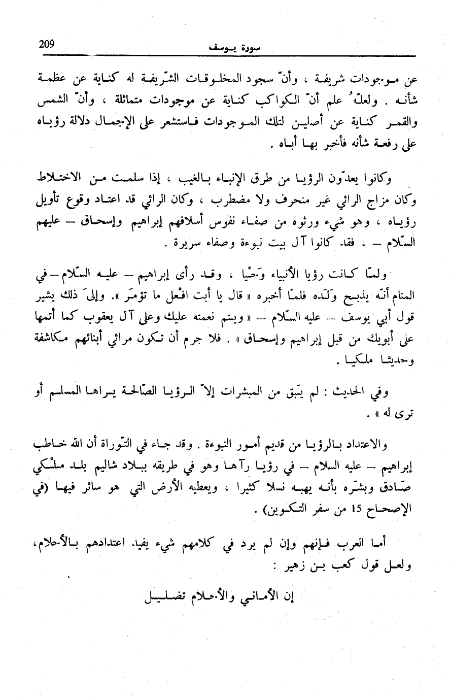 عَنْ مَوْجُودَاتٍ شَرِيفَةٍ، وَأَنَّ سُجُودَ الْمَخْلُوقَاتِ الشَّرِيفَةِ لَهُ كِنَايَةٌ عَنْ عَظَمَةِ شَأْنِهِ. وَلَعَلَّهُ عَلِمَ أَنَّ الْكَوَاكِبَ كِنَايَةٌ عَنْ مَوْجُودَاتٍ مُتَمَاثِلَةٍ، وَأَنَّ الشَّمْسَ وَالْقَمَرَ كِنَايَةٌ عَنْ أَصْلَيْنِ لِتِلْكَ الْمَوْجُودَاتِ فَاسْتَشْعَرَ عَلَى الْإِجْمَالِ دَلَالَةَ رُؤْيَاهُ عَلَى رِفْعَةِ شَأْنِهِ فَأَخْبَرَ بِهَا أَبَاهُ.