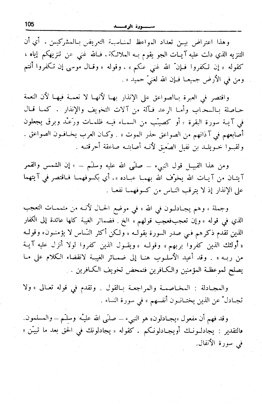 1] وَقَوْلِهِ: أُولئِكَ الَّذِينَ كَفَرُوا بِرَبِّهِمْ [الرَّعْد: 5] وَقَوْلِهِ: وَيَقُولُ الَّذِينَ كَفَرُوا لَوْلا أُنْزِلَ عَلَيْهِ آيَةٌ مِنْ رَبِّهِ [الرَّعْد: 7] . وَقَدْ أُعِيدَ الْأُسْلُوبُ هُنَا إِلَى ضَمَائِرِ الْغَيْبَةِ لِانْقِضَاءِ الْكَلَامِ عَلَى مَا يَصْلُحُ لِمَوْعِظَةِ الْمُؤْمِنِينَ وَالْكَافِرِينَ فَتَمَحَّضَ تَخْوِيفُ الْكَافِرِينَ.