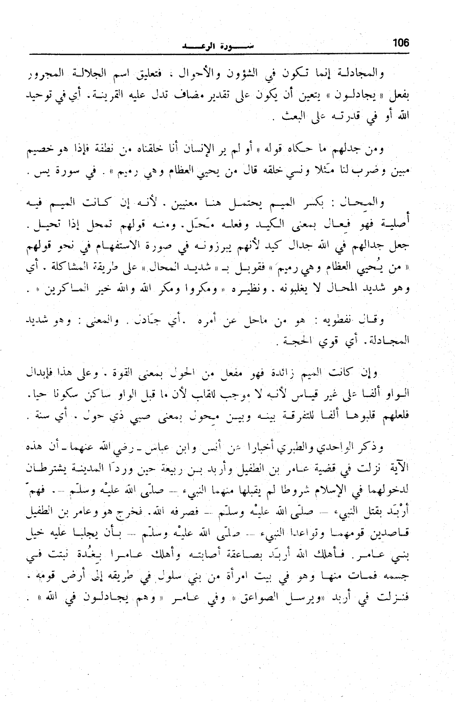 وَذَكَرَ الْوَاحِدِيُّ وَالطَّبَرِيُّ أَخْبَارًا عَنْ أَنَسٍ وَابْنِ عَبَّاسٍ- رَضِيَ اللَّهُ عَنْهُمَا- أَنَّ هَذِهِ الْآيَةَ نَزَلَتْ فِي قَضِيَّةِ عَامِرِ بْنِ الطُّفَيْلِ وَأَرْبَدَ بْنِ رَبِيعَةَ حِينَ وَرَدَا الْمَدِينَة يشترطان لدخلولهما فِي الْإِسْلَامِ شُرُوطًا لَمْ يَقْبَلْهَا مِنْهُمَا النَّبِيءُ صَلَّى اللهُ عَلَيْهِ وَسَلَّمَ. فَهَمَّ أَرْبَدُ بِقَتْلِ النَّبِيءِ صَلَّى اللهُ عَلَيْهِ وَسَلَّمَ فَصَرَفَهُ اللَّهُ، فَخَرَجَ هُوَ وَعَامِرُ بْنُ الطُّفَيْلِ قَاصِدَيْنِ قَوْمَهُمَا وَتَوَاعَدَا النَّبِيءَ صَلَّى اللهُ عَلَيْهِ وَسَلَّمَ بِأَنْ يَجْلِبَا عَلَيْهِ خَيْلَ بَنِي عَامِرٍ. فَأَهْلَكَ اللَّهُ أَرْبَدَ بِصَاعِقَةٍ أَصَابَتْهُ وَأَهْلَكَ عَامِرًا بِغُدَّةٍ نَبَتَتْ فِي جِسْمِهِ فَمَاتَ مِنْهَا وَهُوَ فِي بَيْتِ امْرَأَةٍ مِنْ بَنِي سَلُولٍ فِي طَرِيقِهِ إِلَى أَرْضِ قَوْمِهِ، فَنَزَلَتْ فِي أَرْبَدَ وَيُرْسِلُ الصَّواعِقَ وَفِي عَامِرٍ وَهُمْ يُجادِلُونَ فِي اللَّهِ