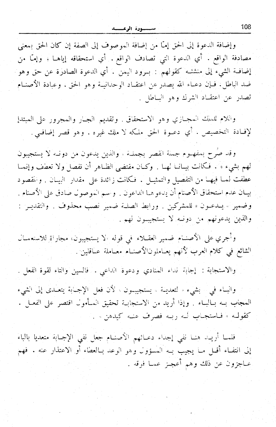 وَقَدْ صَرَّحَ بِمَفْهُومِ جُمْلَةِ الْقَصْرِ بِجُمْلَةِ وَالَّذِينَ يَدْعُونَ مِنْ دُونِهِ لَا يَسْتَجِيبُونَ لَهُمْ بِشَيْءٍ [سُورَة الرَّعْد: 14] ، فَكَانَتْ بَيَانًا لَهَا. وَكَانَ مُقْتَضَى الظَّاهِرِ أَنْ تُفْصَلَ وَلَا تُعْطَفَ وَإِنَّمَا عُطِفَتْ لِمَا فِيهَا من التَّفْصِيل وَالتَّمْثِيلِ، فَكَانَتْ زَائِدَةً عَلَى مِقْدَارِ الْبَيَانِ. وَالْمَقْصُودُ بَيَانُ عَدَمِ اسْتِحْقَاقِ الْأَصْنَامِ أَنْ يَدْعُوَهَا الدَّاعُونَ. وَاسْمُ الْمَوْصُولِ صَادِقٌ عَلَى الْأَصْنَامِ.