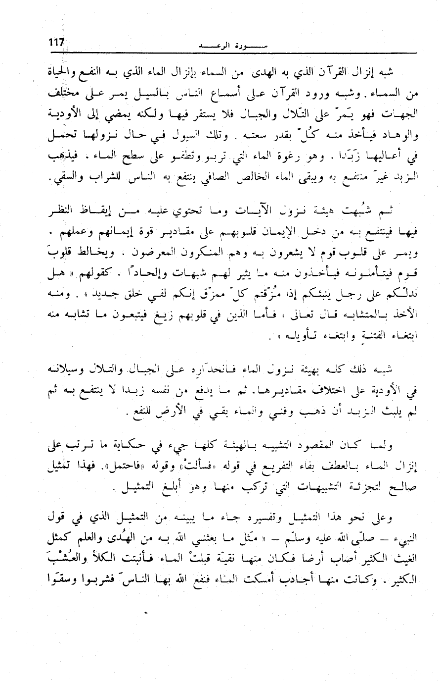شُبِّهَ إِنْزَالُ الْقُرْآنِ الَّذِي بِهِ الْهُدَى مِنَ السَّمَاءِ بِإِنْزَالِ الْمَاءِ الَّذِي بِهِ النَّفْعُ وَالْحَيَاةُ مِنَ السَّمَاءِ. وَشُبِّهَ وُرُودُ الْقُرْآنِ عَلَى أَسْمَاعِ النَّاسِ بِالسَّيْلِ يَمُرُّ عَلَى مُخْتَلَفِ الْجِهَاتِ فَهُوَ يَمُرُّ عَلَى التِّلَالِ وَالْجِبَالِ فَلَا يَسْتَقِرُّ فِيهَا وَلَكِنَّهُ يَمْضِي إِلَى الْأَوْدِيَةِ وَالْوِهَادِ فَيَأْخُذُ مِنْهُ كُلٌّ بِقَدْرِ سَعَتِهِ. وَتِلْكَ السُّيُولُ فِي حَالِ نُزُولِهَا تَحْمِلُ فِي أَعَالِيهَا زَبَدًا، وَهُوَ رَغْوَةُ الْمَاءِ الَّتِي تَرْبُو