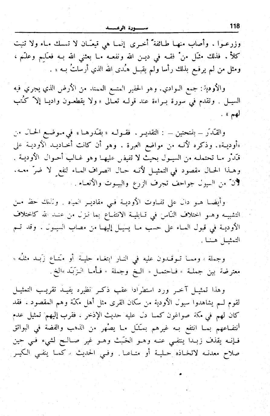 وَأَيْضًا هُوَ دَالٌّ عَلَى تَفَاوُتِ الْأَوْدِيَةِ فِي مَقَادِيرِ الْمِيَاهِ. وَلِذَلِكَ حَظٌّ مِنَ التَّشْبِيهِ وَهُوَ اخْتِلَافُ النَّاسِ فِي قَابِلِيَّةِ الِانْتِفَاعِ بِمَا نَزَلَ مِنْ عِنْدِ اللَّهِ كَاخْتِلَافِ الْأَوْدِيَةِ فِي قَبُولِ الْمَاءِ عَلَى حَسَبِ مَا يَسِيلُ إِلَيْهَا مِنْ مَصَابِّ السُّيُولِ، وَقَدْ تَمَّ التَّمْثِيلُ هُنَا.