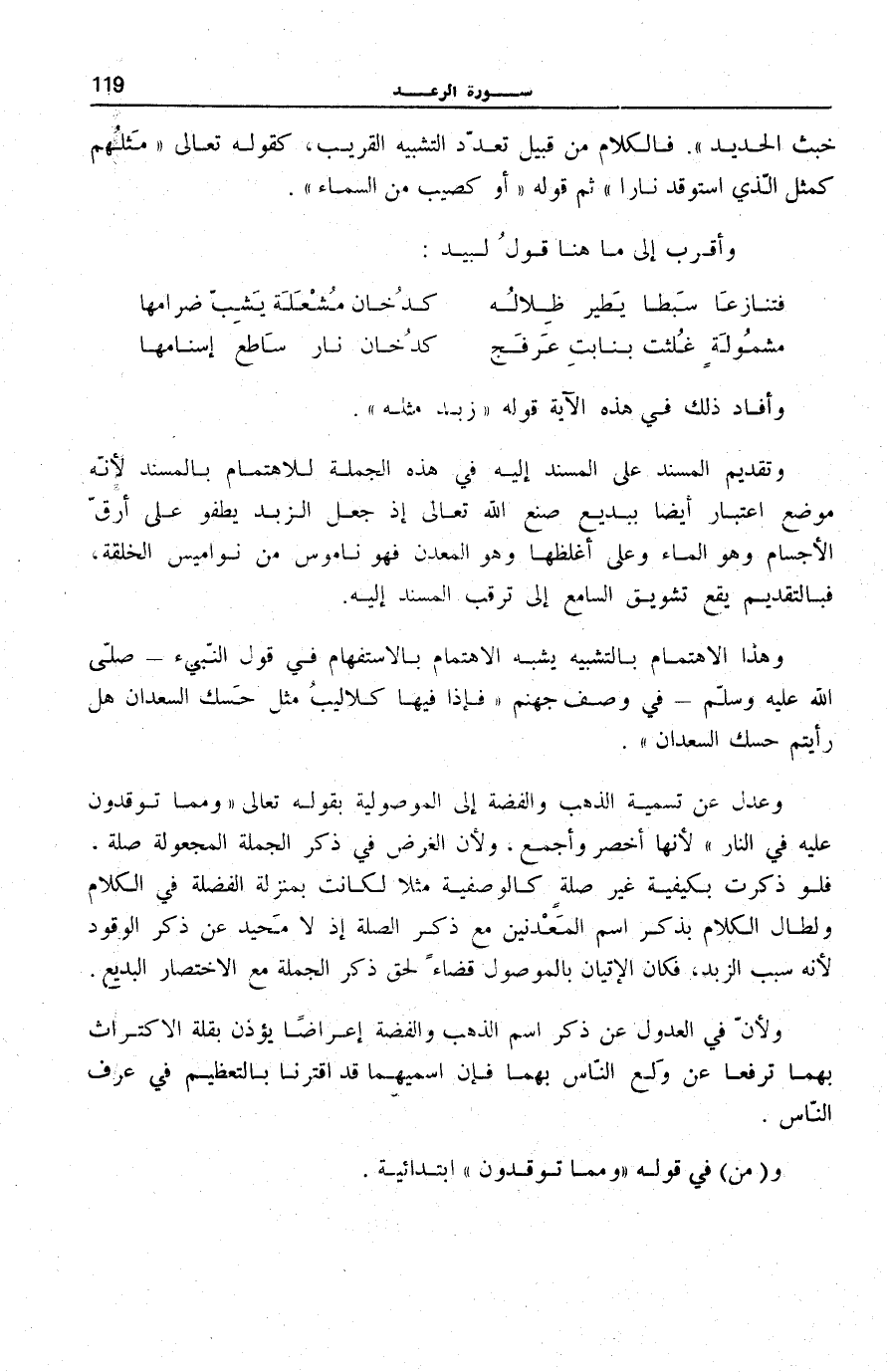 فِي النَّارِ لِأَنَّهَا أَخْصَرُ وَأَجْمَعُ، وَلِأَنَّ الْغَرَضَ فِي ذِكْرِ الْجُمْلَةِ الْمَجْعُولَةِ صِلَةً، فَلَوْ ذُكِرَتْ بِكَيْفِيَّةٍ غَيْرِ صِلَةٍ كَالْوَصْفِيَّةِ مَثَلًا لَكَانَتْ بِمَنْزِلَةِ الْفَضْلَةِ فِي الْكَلَامِ وَلَطَالَ الْكَلَامُ بِذِكْرِ اسْمِ الْمَعْدِنَيْنِ مَعَ ذِكْرِ الصِّلَةِ إِذْ لَا مَحِيدَ عَنْ ذِكْرِ الْوَقُودِ لِأَنَّهُ سَبَبُ الزَّبَدِ، فَكَانَ الْإِتْيَانُ بِالْمَوْصُولِ قَضَاءً لِحَقِّ ذِكْرِ الْجُمْلَةِ مَعَ الِاخْتِصَارِ الْبَدِيعِ.