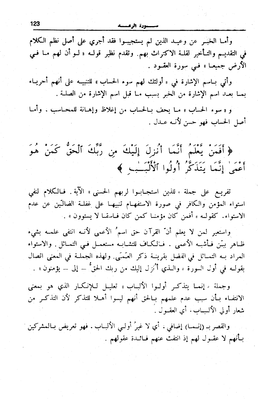 وَاسْتُعِيرَ لِمَنْ لَا يَعْلَمُ أَنَّ الْقُرْآنَ حَقٌّ اسْمُ الْأَعْمَى لِأَنَّهُ انْتَفَى عِلْمُهُ بِشَيْءٍ ظَاهِرٍ بَيِّنٍ فَأَشْبَهَ الْأَعْمَى، فَالْكَافُ لِلتَّشَابُهِ مُسْتَعْمَلٌ فِي التَّمَاثُلِ. وَالِاسْتِوَاءُ الْمُرَادُ بِهِ التَّمَاثُلُ فِي الْفَضْلِ بِقَرِينَةِ ذِكْرِ الْعَمَى. وَلِهَذِهِ الْجُمْلَةِ فِي الْمَعْنَى اتِّصَالٌ بِقَوْلِهِ فِي أَوَّلِ السُّورَةِ وَالَّذِي أُنْزِلَ إِلَيْكَ مِنْ رَبِّكَ الْحَقُّ- إِلَى- يُؤْمِنُونَ [سُورَة الرَّعْد: 1] . (¬1)