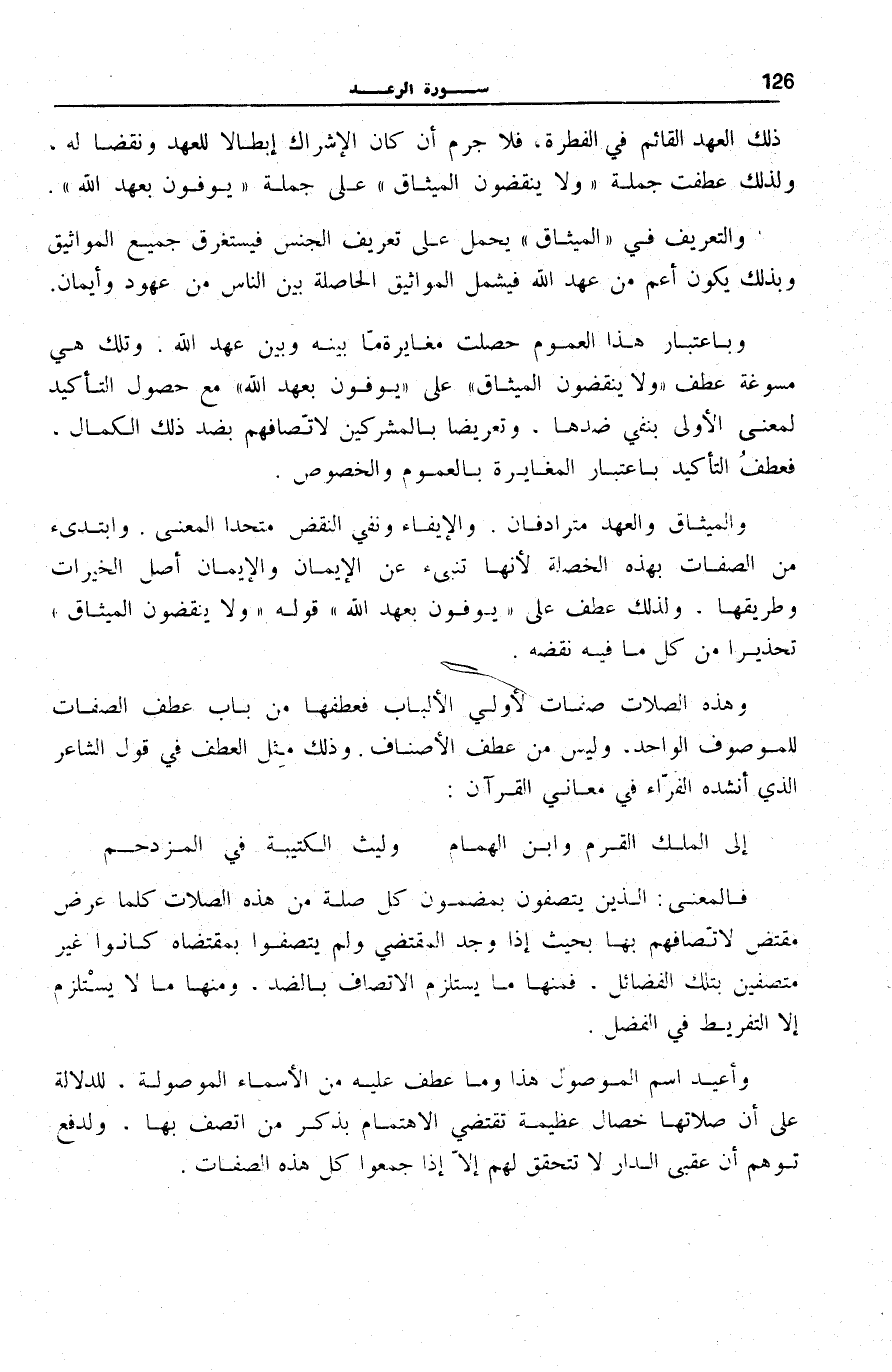 وَبِاعْتِبَارِ هَذَا الْعُمُومِ حَصَلَتْ مُغَايَرَةٌ مَا بَيْنَهُ وَبَيْنَ عَهْدِ اللَّهِ. وَتِلْكَ هِيَ مُسَوِّغَةُ عَطْفِ وَلا يَنْقُضُونَ الْمِيثاقَ عَلَى يُوفُونَ بِعَهْدِ اللَّهِ مَعَ حُصُولِ التَّأْكِيدِ لِمَعْنَى الْأُولَى بِنَفْيِ ضِدِّهَا، وَتَعْرِيضًا بِالْمُشْرِكِينَ لِاتِّصَافِهِمْ بِضِدِّ ذَلِكَ الْكَمَالِ، فَعُطِفَ التَّأْكِيدُ بِاعْتِبَارِ الْمُغَايَرَةِ بِالْعُمُومِ وَالْخُصُوصِ.