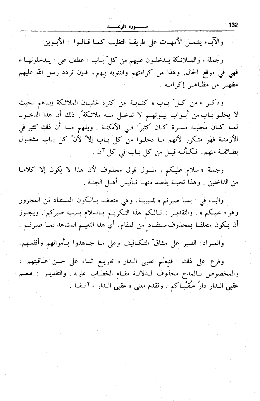 وَجُمْلَةُ وَالْمَلائِكَةُ يَدْخُلُونَ عَلَيْهِمْ مِنْ كُلِّ بابٍ عَطْفٌ عَلَى يَدْخُلُونَها فَهِيَ فِي مَوْقِعِ الْحَالِ. وَهَذَا مِنْ كَرَامَتِهِمْ وَالتَّنْوِيهِ بِهِمْ، فَإِنَّ تَرَدُّدَ رُسُلِ اللَّهِ عَلَيْهِمْ مَظْهَرٌ مِنْ مَظَاهِرِ إِكْرَامِهِ.