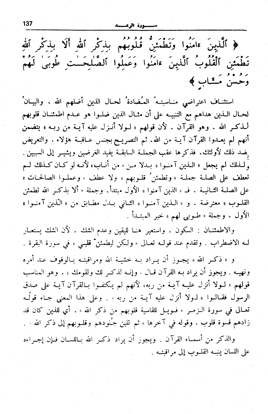 اسْتِئْنَافٌ اعْتِرَاضِيٌّ مُنَاسَبَتُهُ الْمُضَادَّةُ لِحَالِ الَّذِينَ أَضَلَّهُمُ اللَّهُ، وَالْبَيَانُ لِحَالِ الَّذِينَ هَدَاهُمْ مَعَ التَّنْبِيهِ عَلَى أَنَّ مِثَالَ الَّذِينَ ضَلُّوا هُوَ عَدَمُ اطْمِئْنَانِ قُلُوبِهِمْ لِذِكْرِ اللَّهِ، وَهُوَ الْقُرْآنُ، لِأَنَّ قَوْلَهُمْ: لَوْلا أُنْزِلَ عَلَيْهِ آيَةٌ مِنْ رَبِّهِ يَتَضَمَّنُ أَنَّهُمْ لَمْ يَعُدُّوا الْقُرْآنَ آيَةً مِنَ اللَّهِ، ثُمَّ التَّصْرِيحُ بِجِنْسِ عَاقِبَةِ هَؤُلَاءِ، وَالتَّعْرِيضُ بِضِدِّ ذَلِكَ لِأُولَئِكَ، فَذِكْرُهَا عَقِبَ الْجُمْلَةِ السَّابِقَةِ يُفِيدُ الْغَرَضَيْنِ وَيُشِيرُ إِلَى السَّبَبَيْنِ. وَلِذَلِكَ لَمْ يُجْعَلِ الَّذِينَ آمَنُوا بَدَلًا مِنْ مَنْ أَنابَ [الرَّعْد: 27] لِأَنَّهُ لَوْ كَانَ كَذَلِكَ لَمْ تُعْطَفْ عَلَى الصِّلَةِ جُمْلَةُ وَتَطْمَئِنُّ قُلُوبُهُمْ وَلَا عَطْفُ وَعَمِلُوا الصَّالِحاتِ عَلَى الصِّلَةِ الثَّانِيَةِ. فَ الَّذِينَ آمَنُوا الْأَوَّلُ مُبْتَدَأٌ، وَجُمْلَةُ أَلا بِذِكْرِ اللَّهِ تَطْمَئِنُّ الْقُلُوبُ مُعْتَرِضَةٌ والَّذِينَ آمَنُوا الثَّانِي بَدَلٌ مُطَابِقٌ مِنَ الَّذِينَ آمَنُوا الْأَوَّلِ، وَجُمْلَةُ طُوبى لَهُمْ خبر المبدأ.