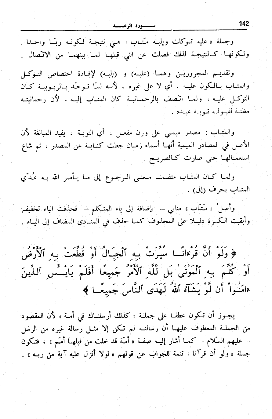يَجُوزُ أَنْ تَكُونَ عَطْفًا عَلَى جُمْلَةِ كَذلِكَ أَرْسَلْناكَ فِي أُمَّةٍ لِأَنَّ الْمَقْصُودَ مِنَ الْجُمْلَةِ الْمَعْطُوفِ عَلَيْهَا أَنَّ رِسَالَتَهُ لَمْ تَكُنْ إِلَّا مِثْلَ رِسَالَةِ غَيْرِهِ مِنَ الرُّسُلِ- عَلَيْهِمُ السَّلَامُ- كَمَا أَشَارَ إِلَيْهِ صِفَةُ أُمَّةٍ قَدْ خَلَتْ مِنْ قَبْلِها أُمَمٌ، فَتَكُونُ جُمْلَةُ وَلَوْ أَنَّ قُرْآناً تَتِمَّةً لِلْجَوَابِ عَنْ قَوْلِهِمْ: لَوْلا أُنْزِلَ عَلَيْهِ آيَةٌ مِنْ رَبِّهِ.
