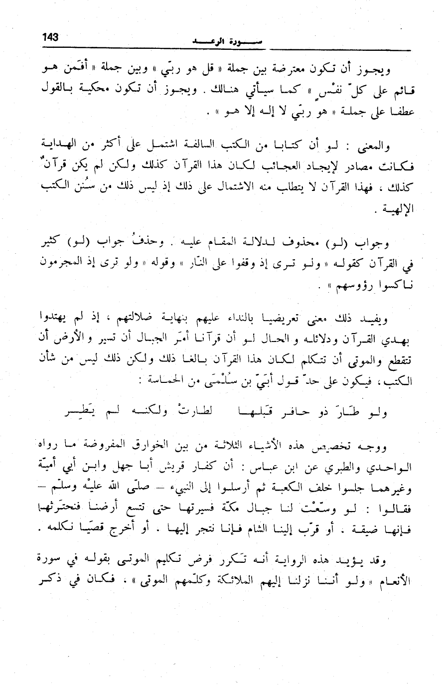 وَالْمَعْنَى: لَوْ أَنَّ كِتَابًا مِنَ الْكُتُبِ السَّالِفَةِ اشْتَمَلَ عَلَى أَكْثَرَ مِنَ الْهِدَايَةِ فَكَانَتْ مَصَادِرَ لِإِيجَادِ الْعَجَائِبِ لَكَانَ هَذَا الْقُرْآنُ كَذَلِكَ وَلَكِنْ لَمْ يَكُنْ قُرْآنٌ كَذَلِكَ، فَهَذَا الْقُرْآنُ لَا يُتَطَلَّبُ مِنْهُ الِاشْتِمَالُ عَلَى ذَلِكَ إِذْ لَيْسَ ذَلِكَ مِنْ سُنَنِ الْكُتُبِ الْإِلَهِيَّةِ.